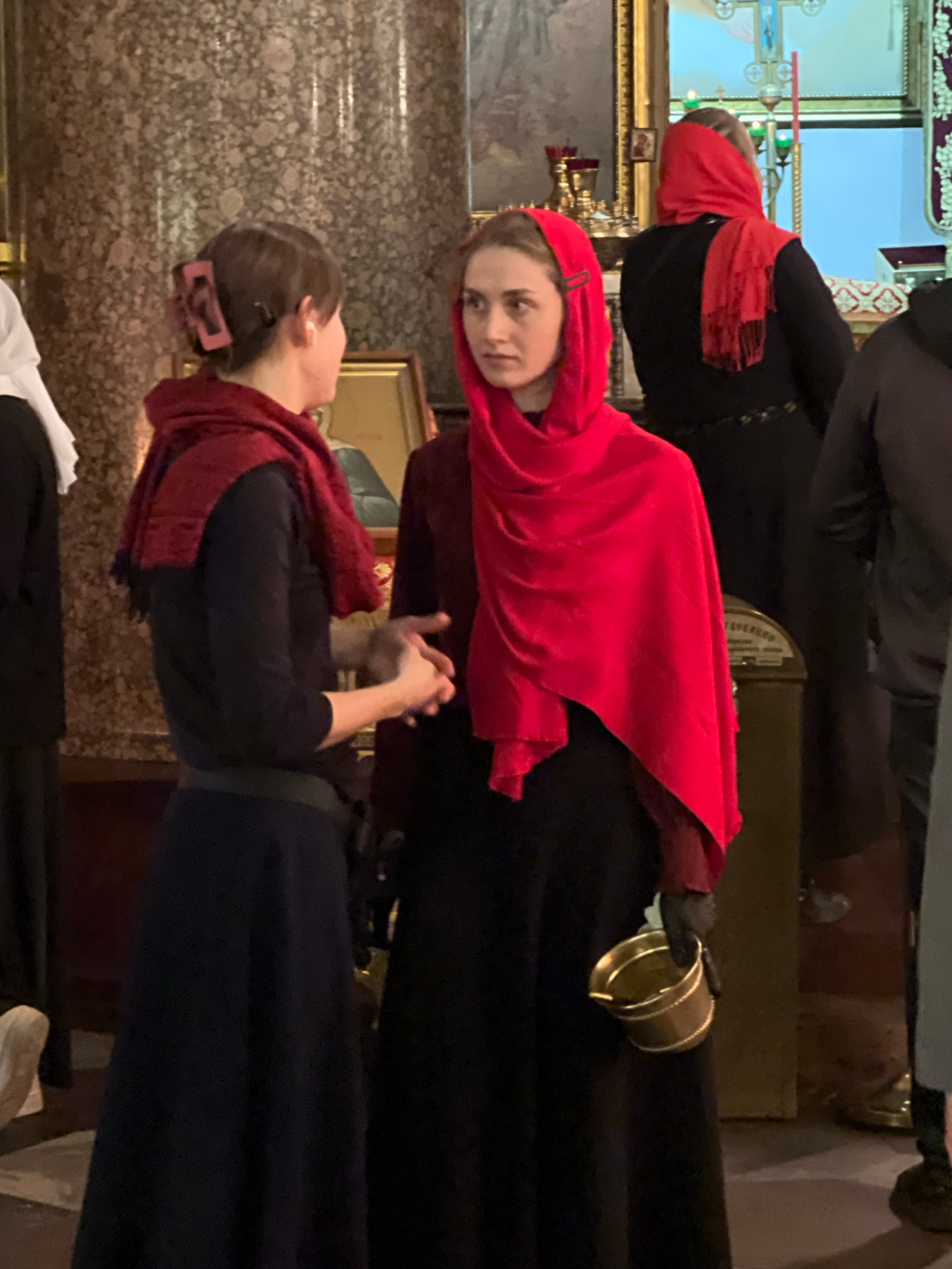 In an interior setting, possibly a church, several individuals are present. Two women in the foreground wear black clothing with red headscarves, one gazing directly at the viewer while the other appe…read more