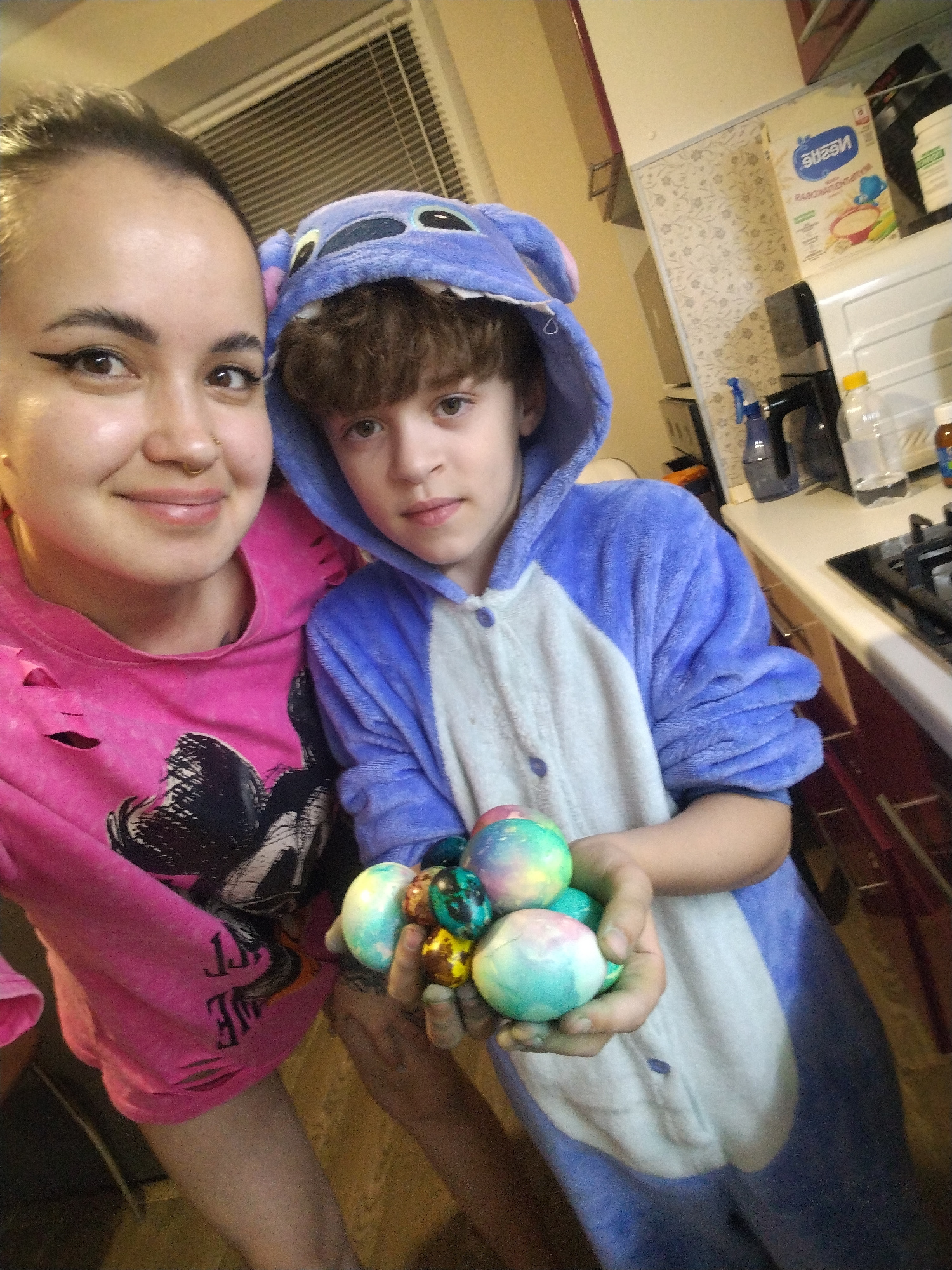 A selfie taken indoors features a woman and a child. The woman, positioned to the left, has her hair pulled back and is wearing a pink, distressed hoodie with a black graphic. To her right, the childβ¦read more