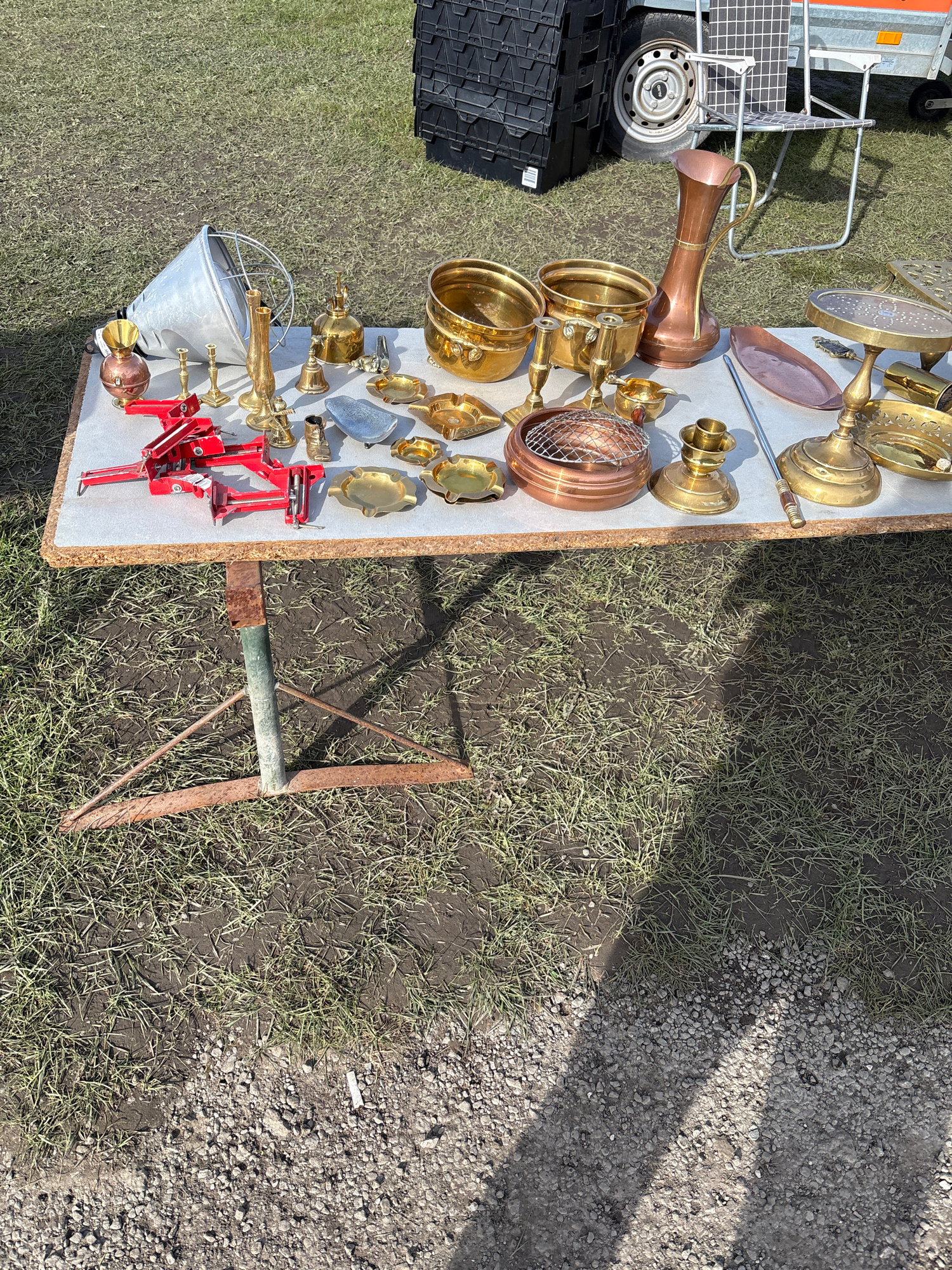 The image shows a selection of brass and copper items displayed on a table outdoors, likely at a market or sale in Chirk, United Kingdom. The objects include candlesticks, pots, a copper pitcher, and…read more