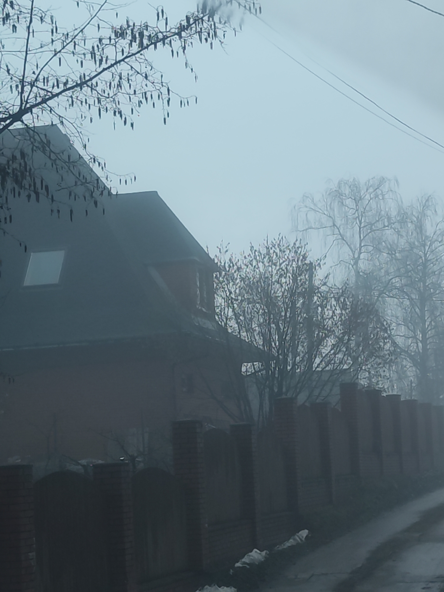 The image depicts a foggy or overcast scene, likely in a residential area. A two-story brick house with a dark, steeply pitched roof is partially visible on the left. The house has a dormer window in…read more