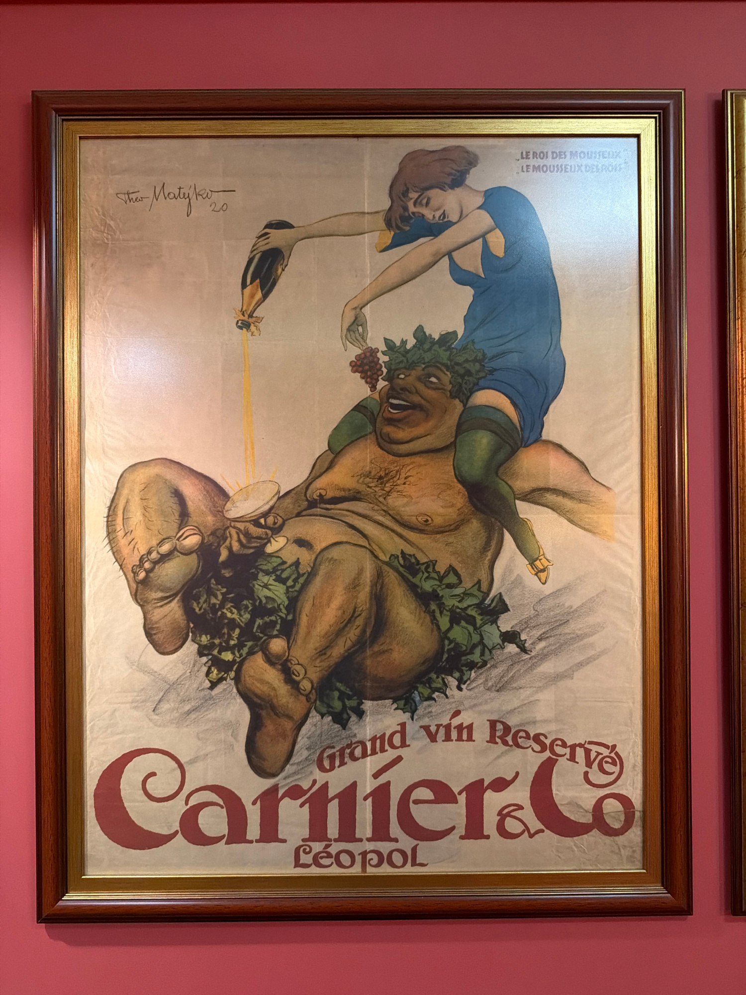 The image captures a framed vintage-style advertising poster, likely for wine or champagne, displayed on a reddish-pink wall in Lviv, Ukraine. The poster features two central figures: an elegant woman…read more