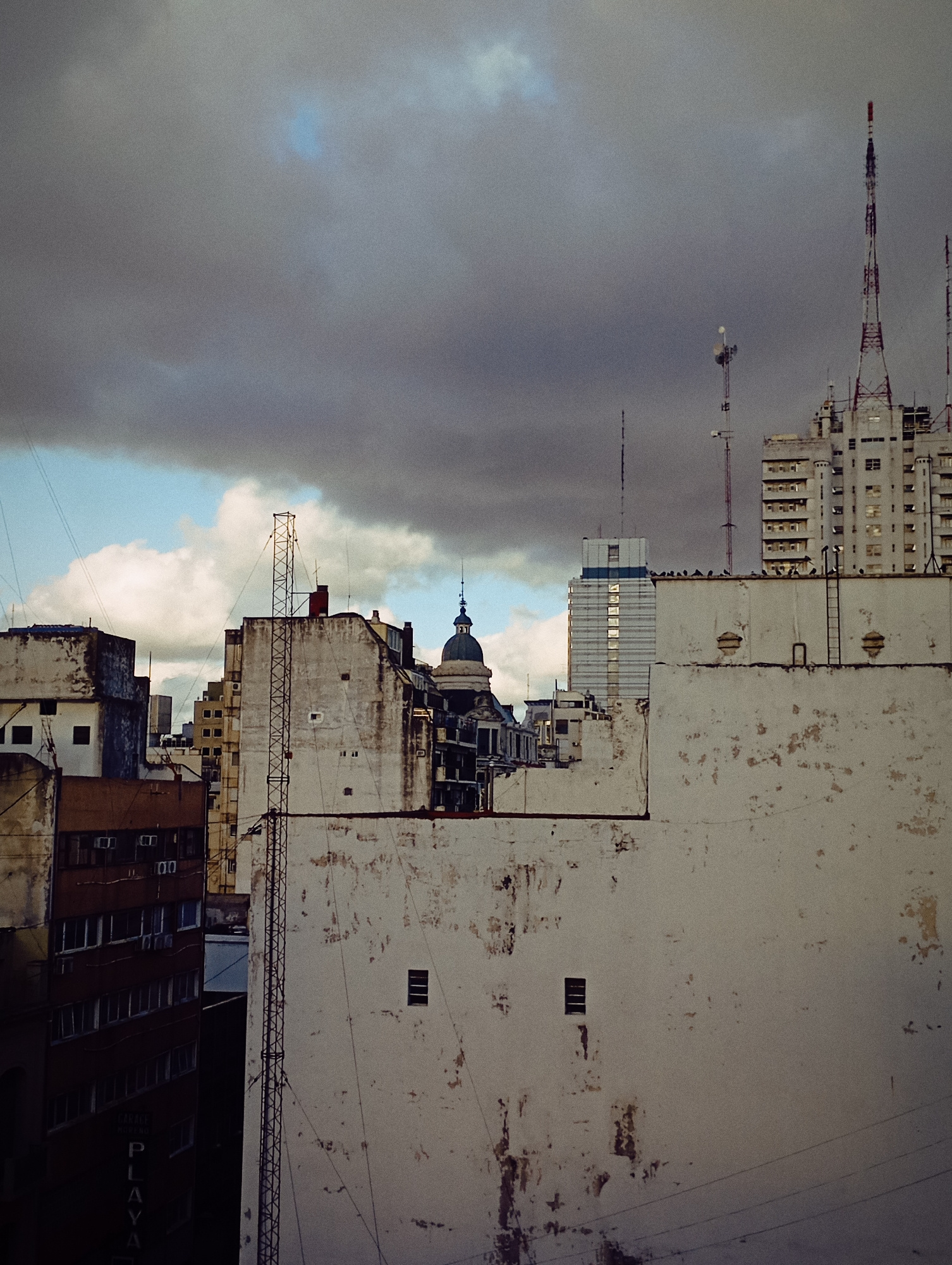 The image shows a cityscape under a cloudy sky, likely taken in Buenos Aires, Argentina, judging by the architectural style and the presence of structures typical of the city. Several buildings of var…read more