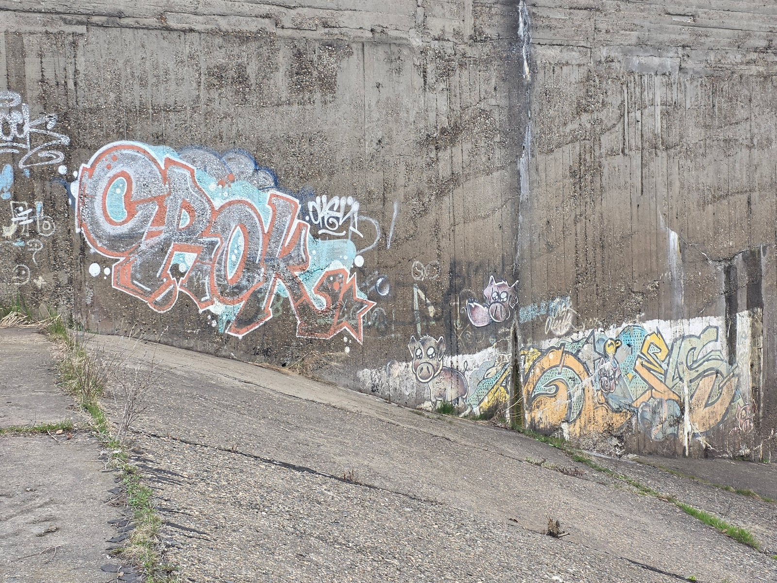 A concrete embankment in Chaikovsky, Russia, is covered with graffiti. The word "CROOK" is spray-painted in stylized letters. Further to the right, there are two cartoon pig-like figures. Another sect…read more