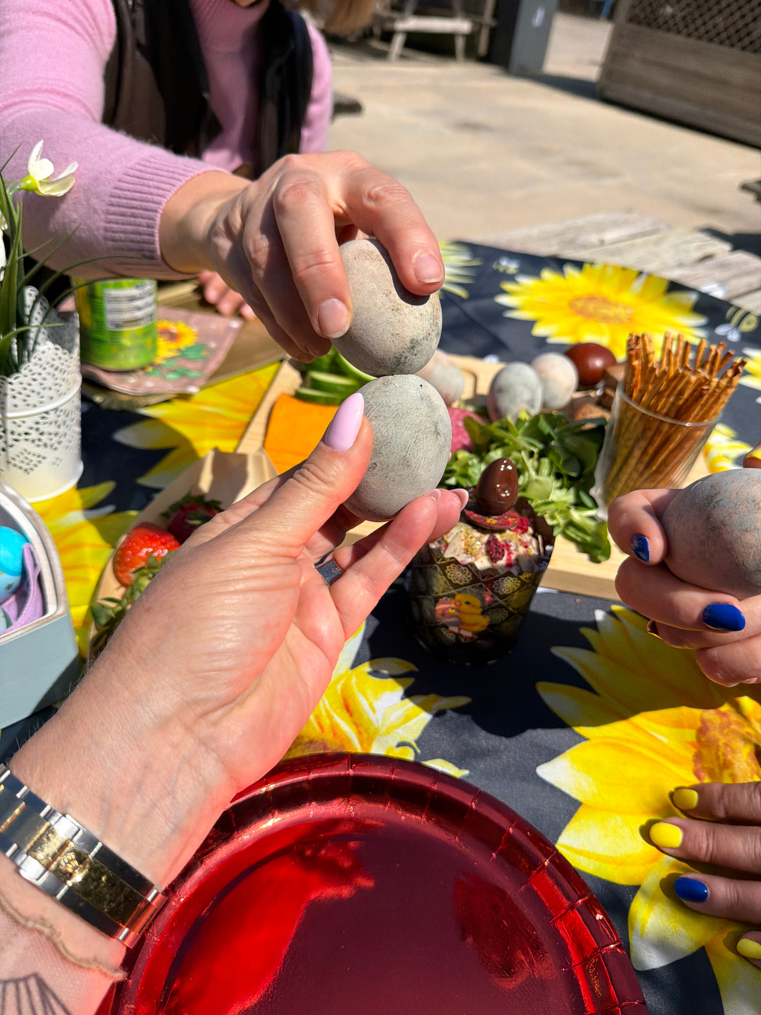 The image captures a festive outdoor gathering, likely an Easter celebration, set in Monistrol de Montserrat, Spain. The scene is viewed from above, focusing on hands and a table laden with food and d…read more