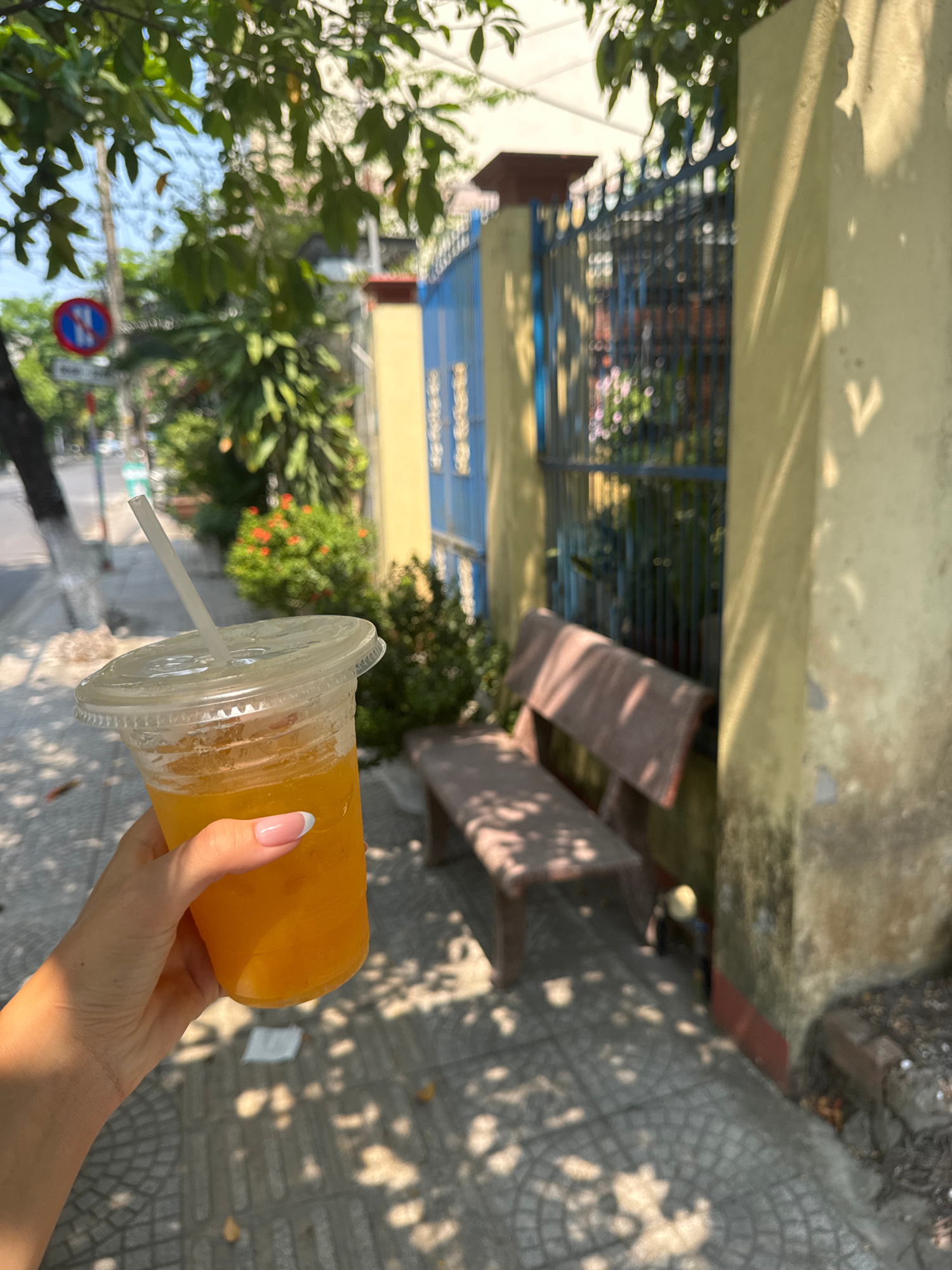 A woman's hand, with a French manicure, holds a plastic cup filled with an orange-colored beverage and a straw. The photograph appears to have been taken outdoors, likely on a sidewalk in Đà Nẵng, Vie…read more