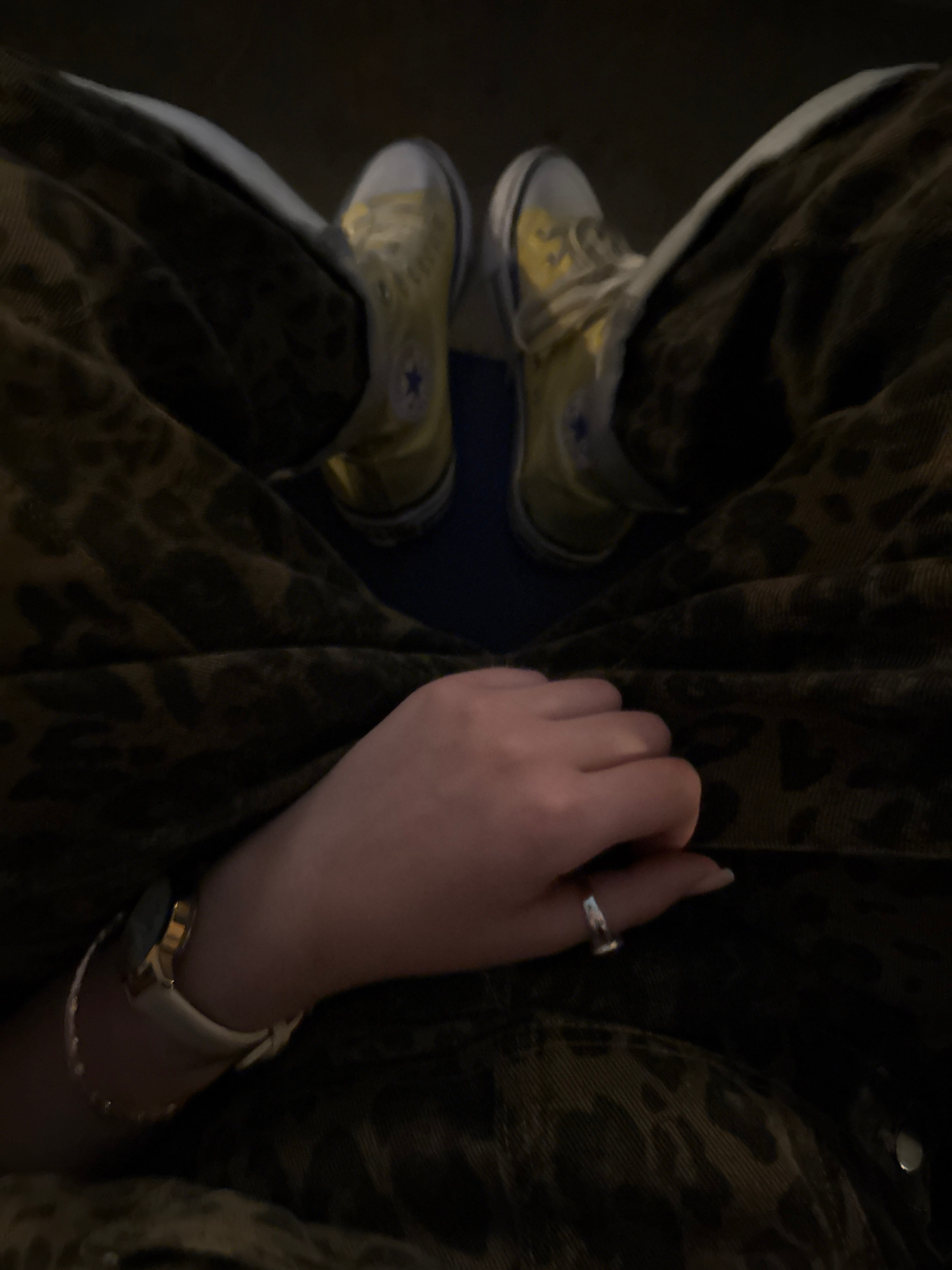 A high-angle shot captures a person seated, wearing yellow Converse sneakers. The subject is wearing patterned pants and shirt. The left hand of the individual is prominently displayed, adorned with a…read more