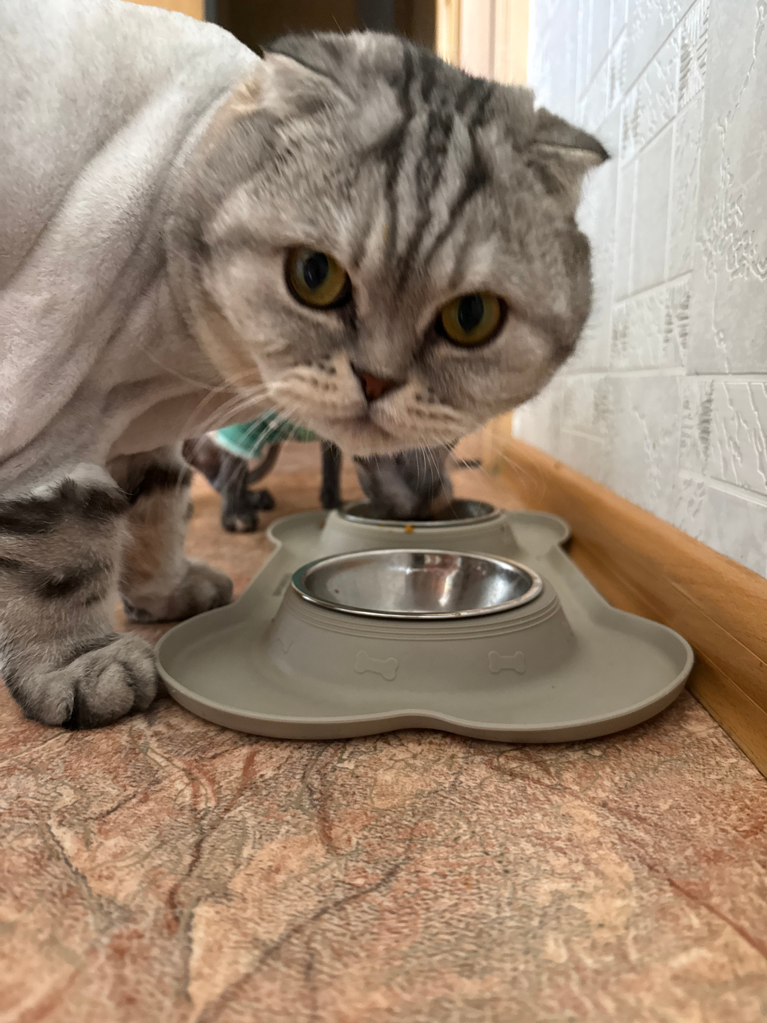 A gray tabby cat with yellowish-green eyes is positioned near a gray double-dish pet feeder set on a mottled tan surface, possibly a floor or countertop. The feeder has two metal bowls. The cat is wea…read more