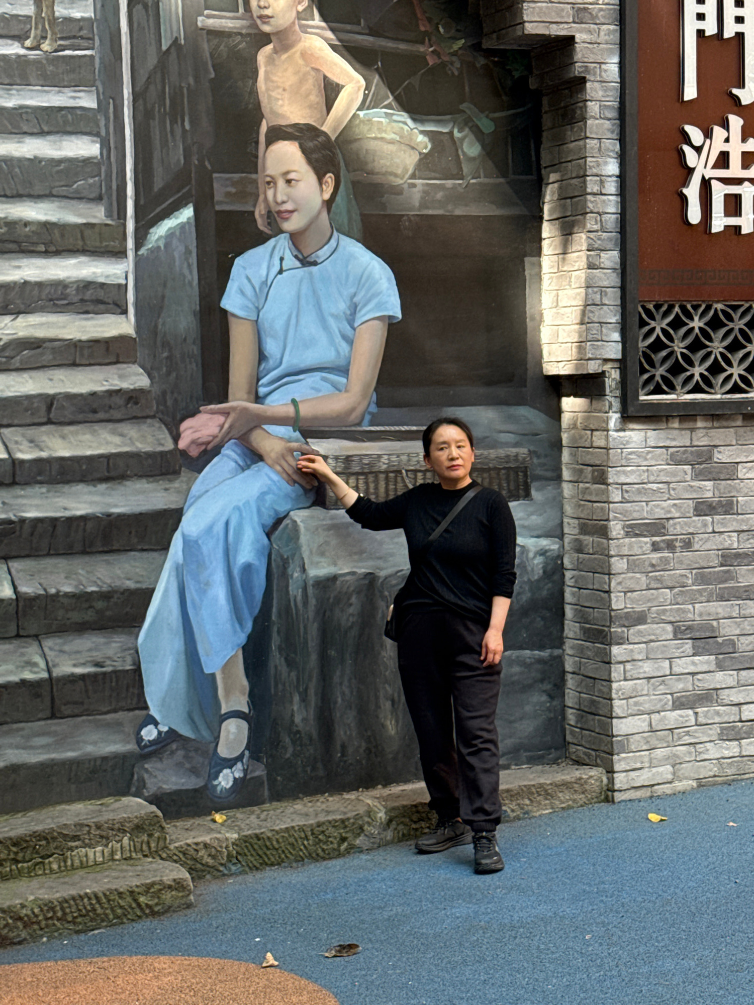 The image, oriented vertically, captures a woman posing alongside a detailed 3D street art painting. The woman, dressed entirely in black with a long-sleeved shirt, pants, and shoes, and carrying a bl…read more