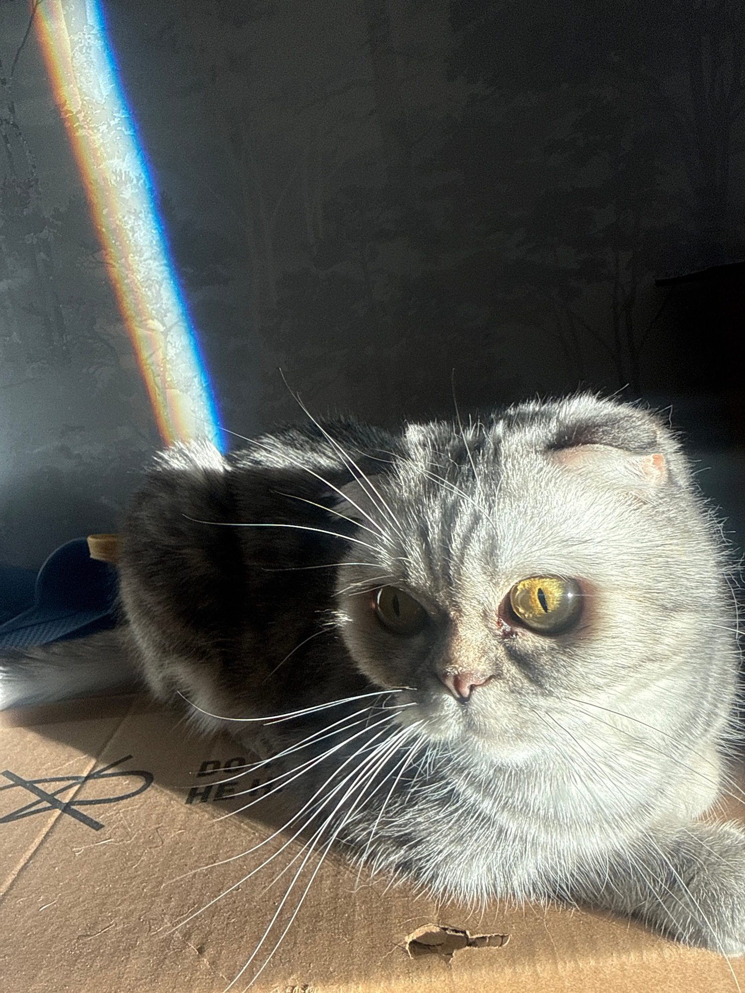 A gray, fluffy cat with yellow-green eyes and folded ears peers into the camera from a cardboard box. A prism of rainbow light falls on the wall to the left of the cat. Part of the cat's body is visibβ¦read more