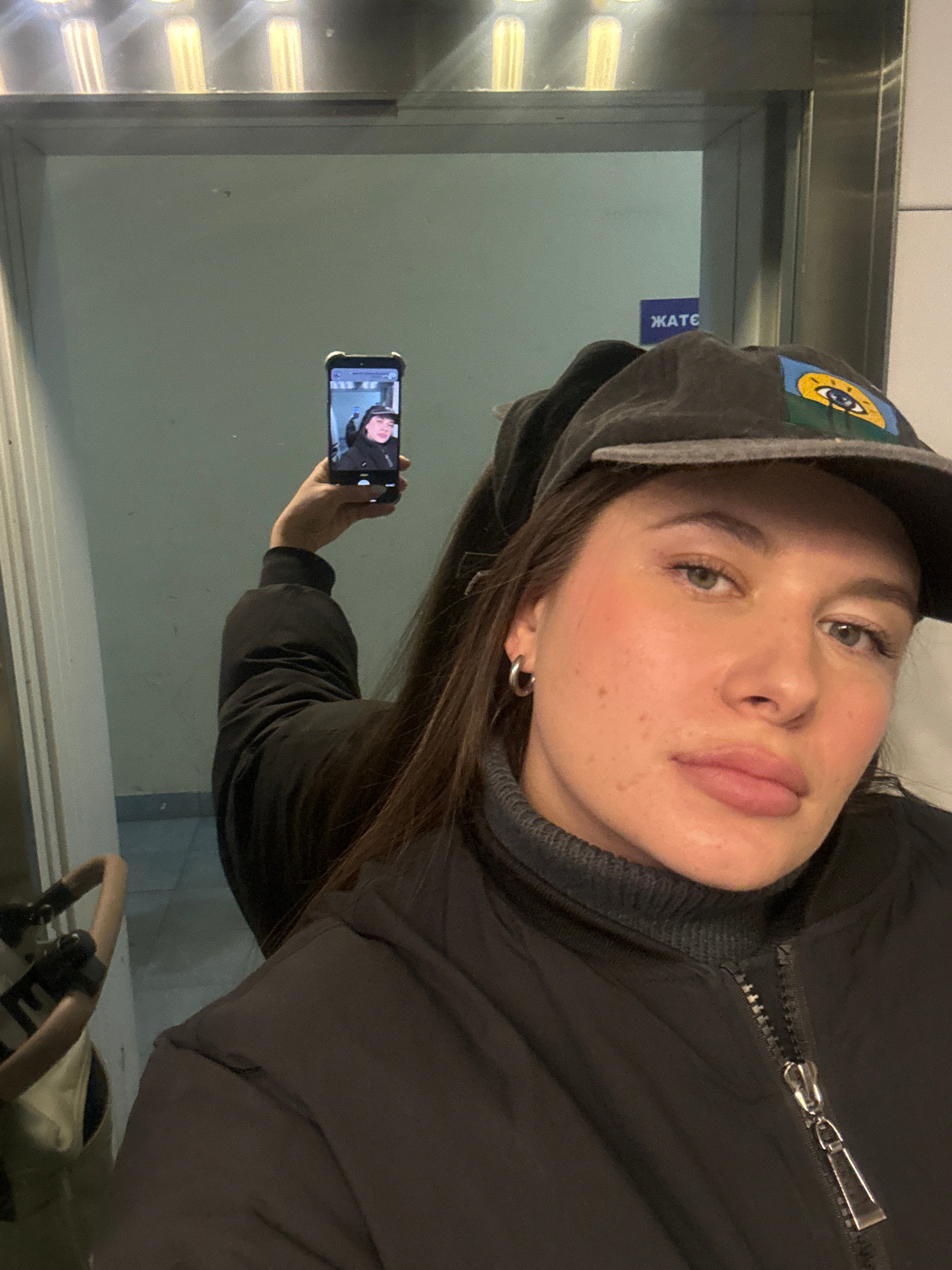 A woman wearing a black jacket and a cap with a patch on it is taking a selfie in what appears to be an elevator. She is holding a smartphone in her left hand, which displays the reflection of herself…read more