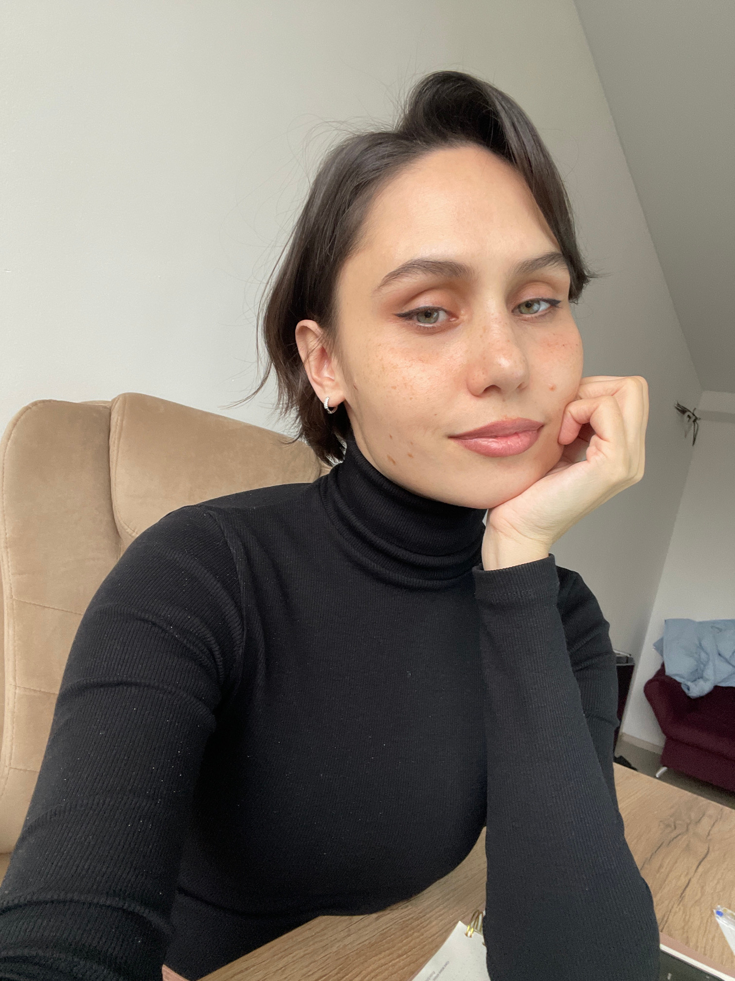 A person with short, dark hair and fair skin is posing for a selfie. They are wearing a black turtleneck sweater. Their right hand is resting on their cheek. They are seated in a beige office chair wi…read more