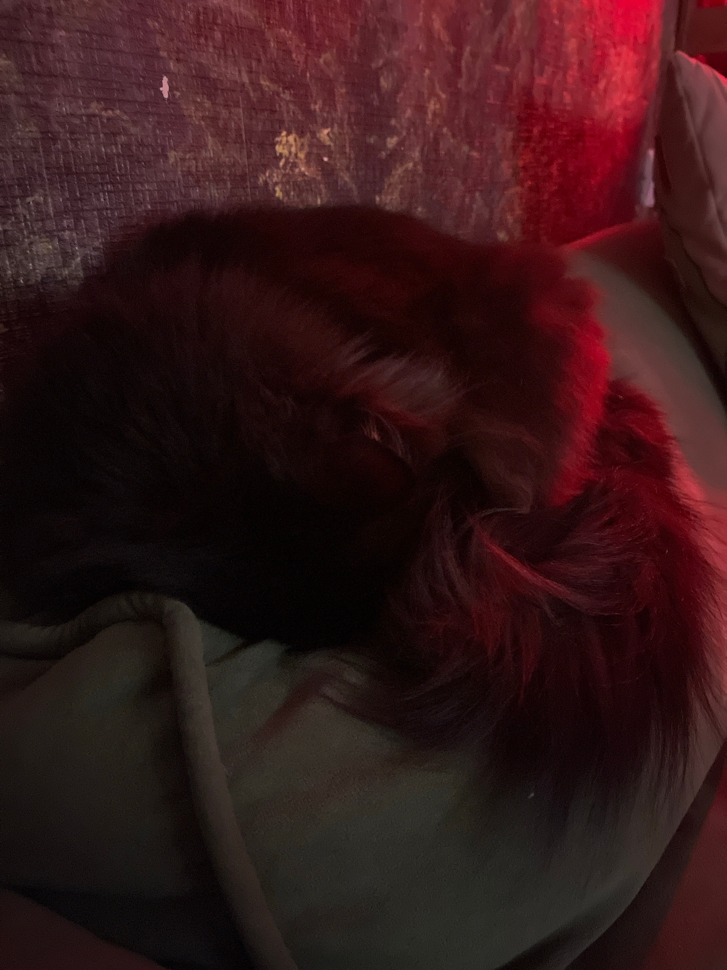 The image shows a dark-haired dog curled up on a cushion. A red light source illuminates the left side of the image, casting a red hue on the dog's fur and the surface it is resting on. The cushion ap…read more