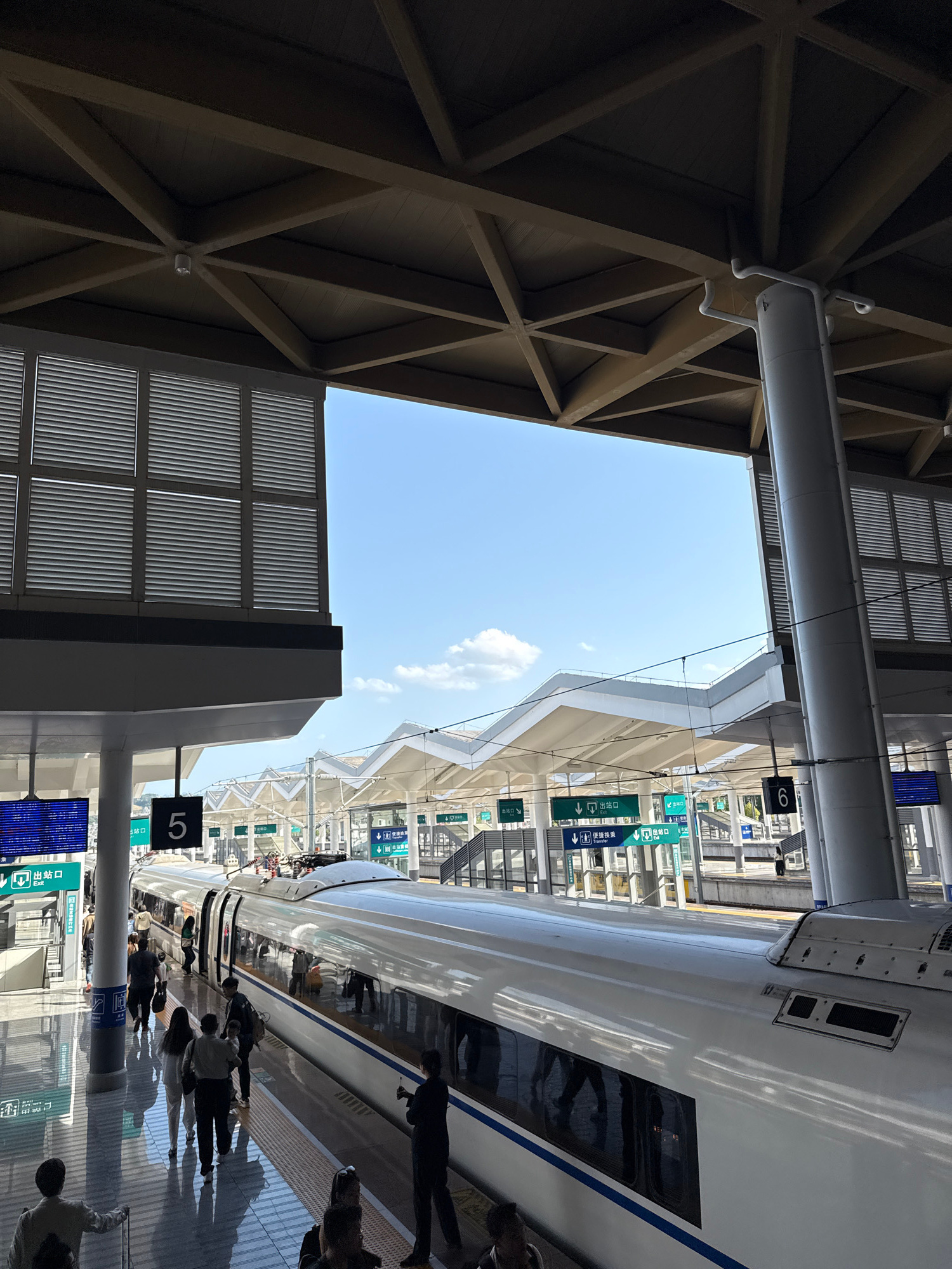The image depicts a high-speed train platform at a modern station in Zhangjiajie, China, under a bright blue sky. The photo is tilted, showing an architectural ceiling on the left, an open sky in the…read more