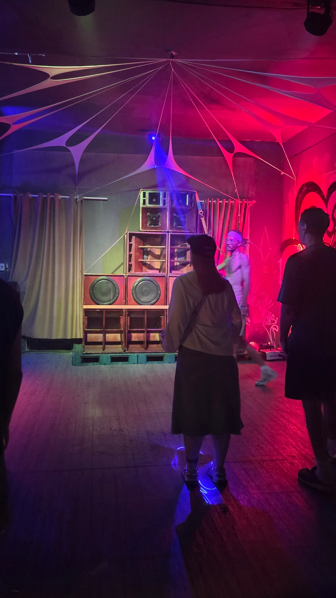 The image captures an indoor scene, likely a music venue or event space, in Nha Trang, Vietnam. Two individuals are visible: one wearing a light-colored top and dark shorts and another wearing a dark-…read more