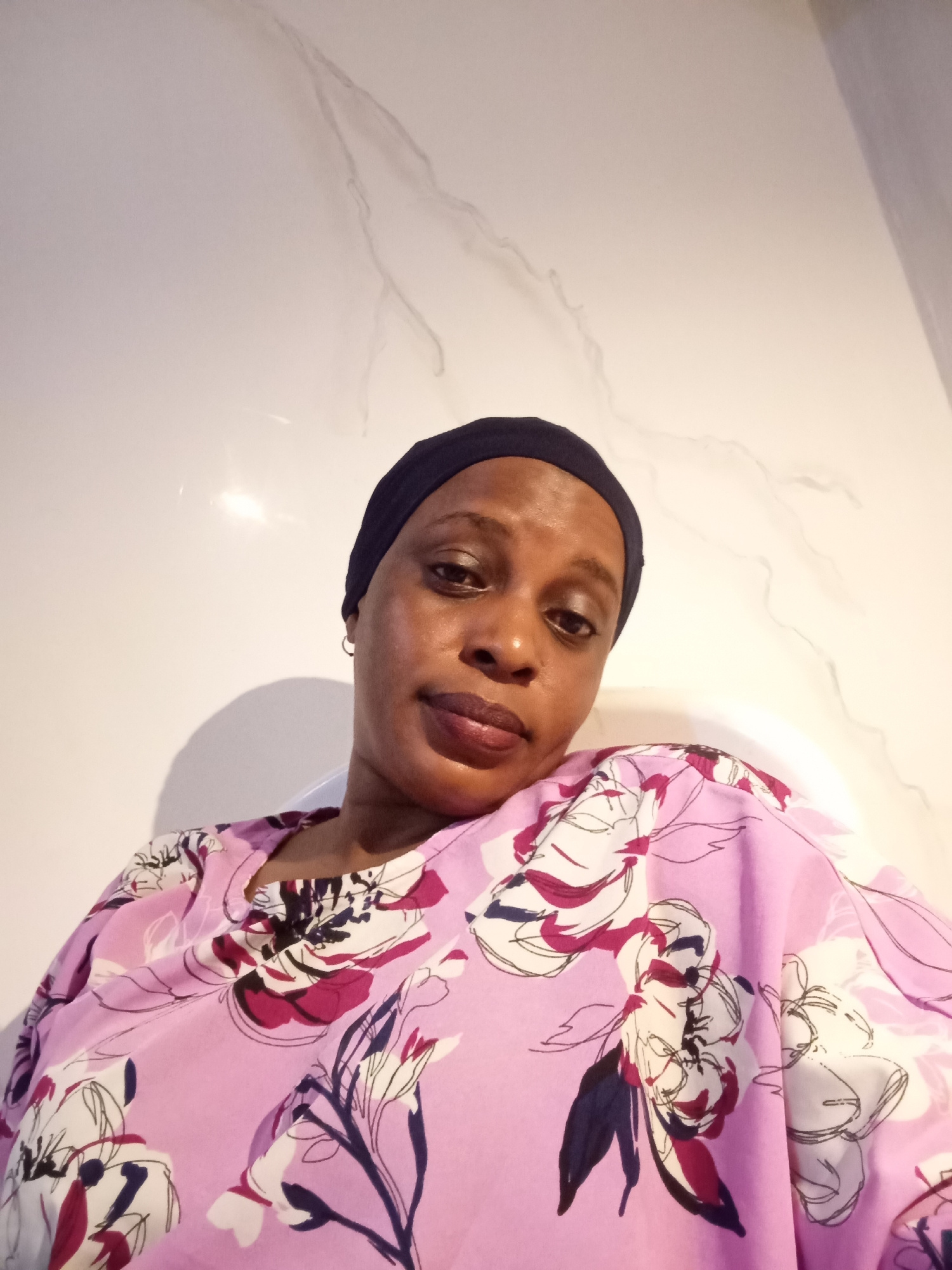 A woman with dark skin and a black head covering is the subject of a selfie. She wears a floral-patterned pink top. The background is a white wall with a faint marble-like design. The location is pres…read more