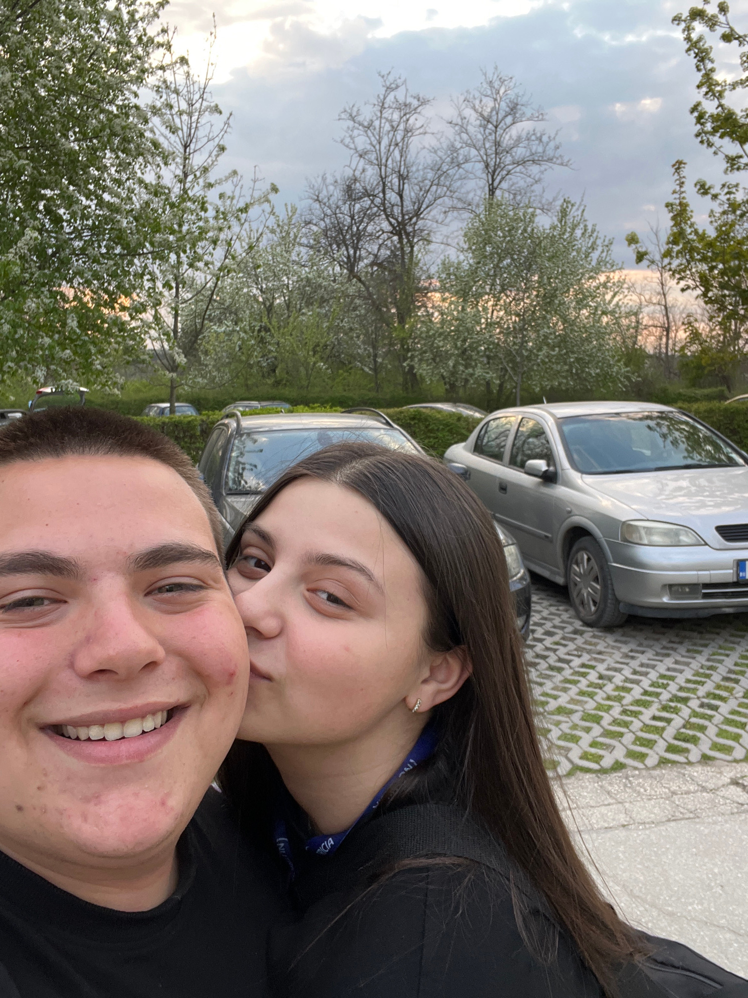 A selfie taken by a male and female. The man has dark hair, light skin, and is smiling. The woman, presumably older, has long, dark hair, light skin, and appears to be resting her head against the man…read more