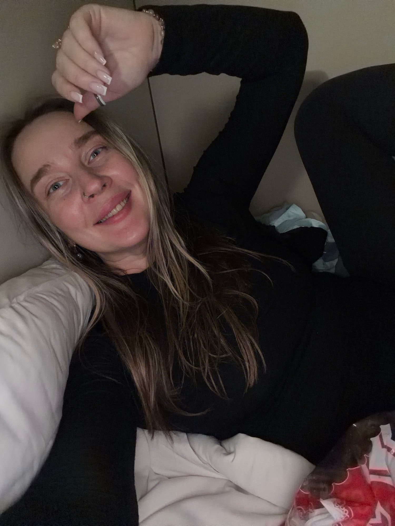 A woman is lying down, seemingly in a domestic setting. She is wearing black leggings and a long-sleeved black top. Her hair is blonde and brown. She has a nose piercing on the left side. Her right ha…read more