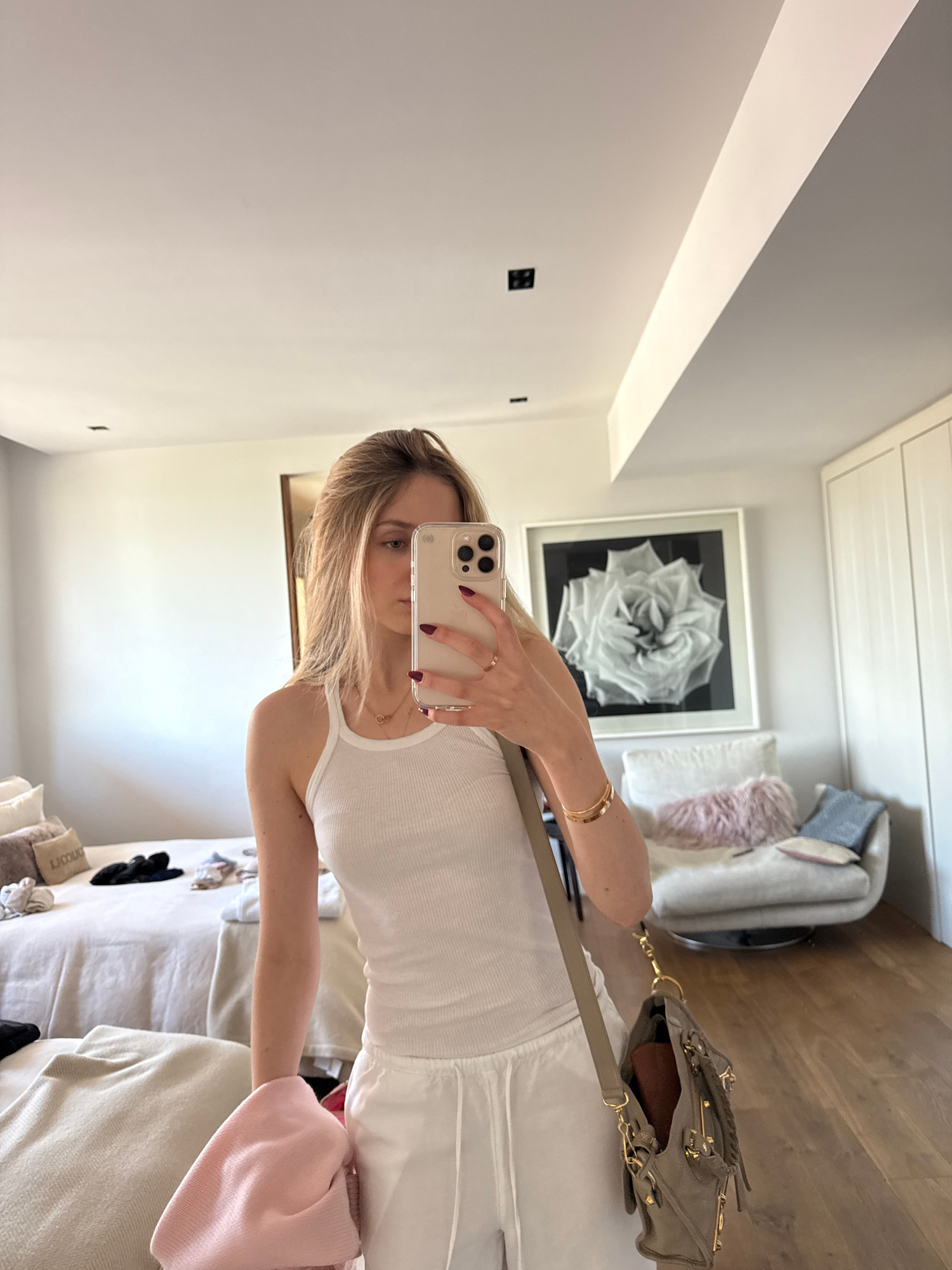 A young adult female, with long blonde hair partially covering her face, is depicted in a full-length mirror selfie inside a brightly lit room. She is wearing a white ribbed tank top, white drawstring…read more