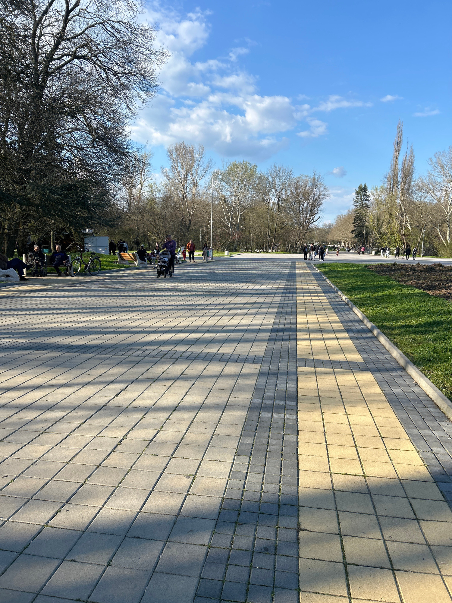 A view of the city park "Nikola Vaptsarov" in Dimitrovgrad, Bulgaria. The image is oriented with the sky at the top left and the parkway extending into the distance from the lower right. A wide paved…read more