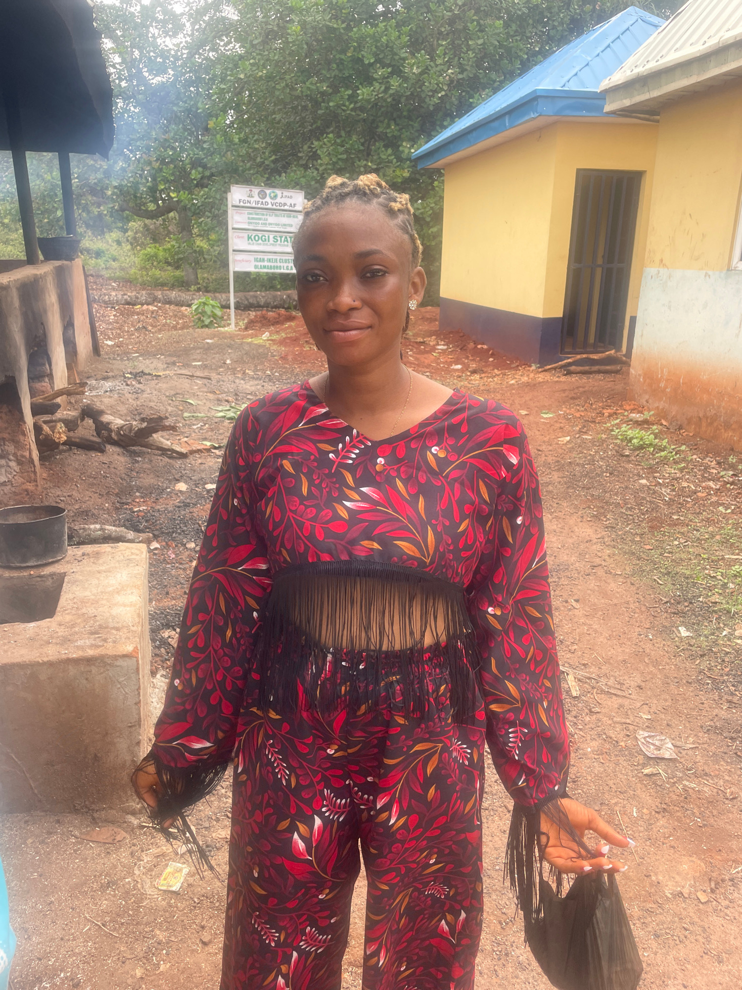A woman stands outside in Eke, Nigeria. She wears a red and black patterned outfit with fringed detailing. Behind her is a yellow building with a blue roof and barred windows. To her left, smoke rises…read more