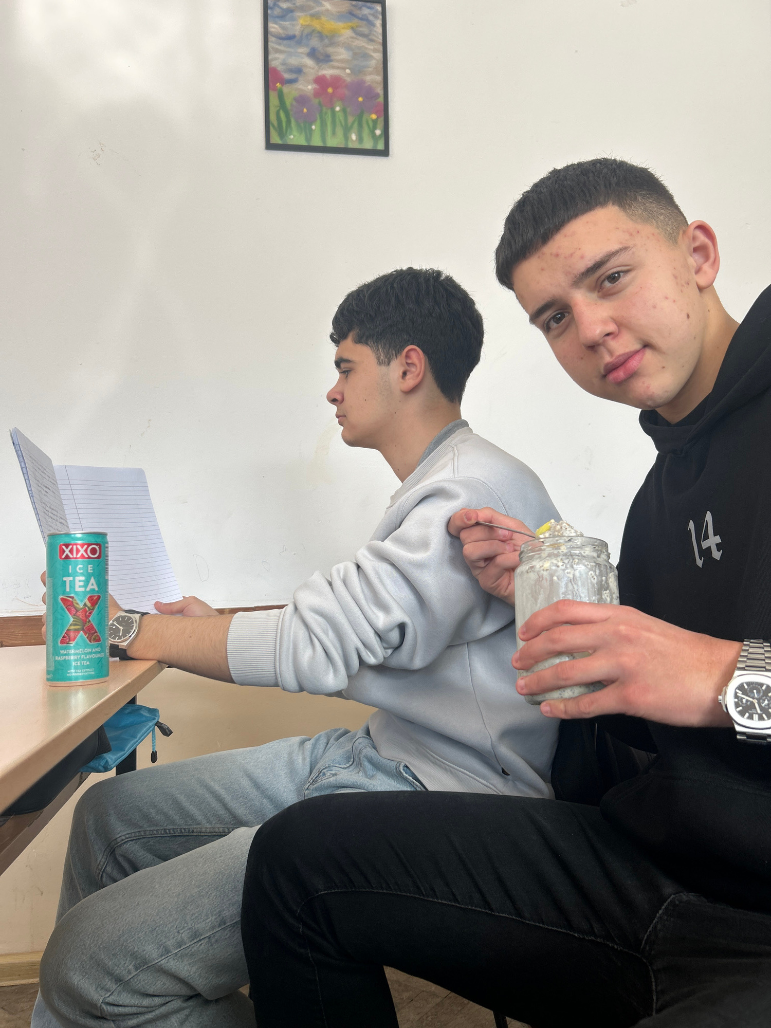 Two young men are indoors. One man, dressed in a black top, black pants, and a silver watch, holds a glass jar with a spoon inside. Another man wears a light blue sweatshirt, light blue jeans, and a s…read more