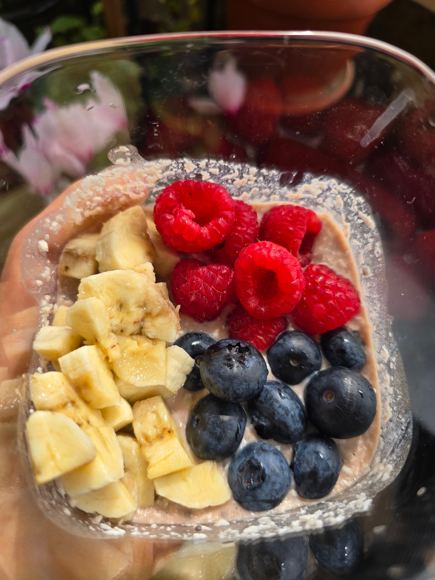 An overhead shot captures a clear plastic container filled with a light brown, creamy substance, likely overnight oats or a smoothie, topped generously with fresh fruit. The fruits are arranged in dis…read more