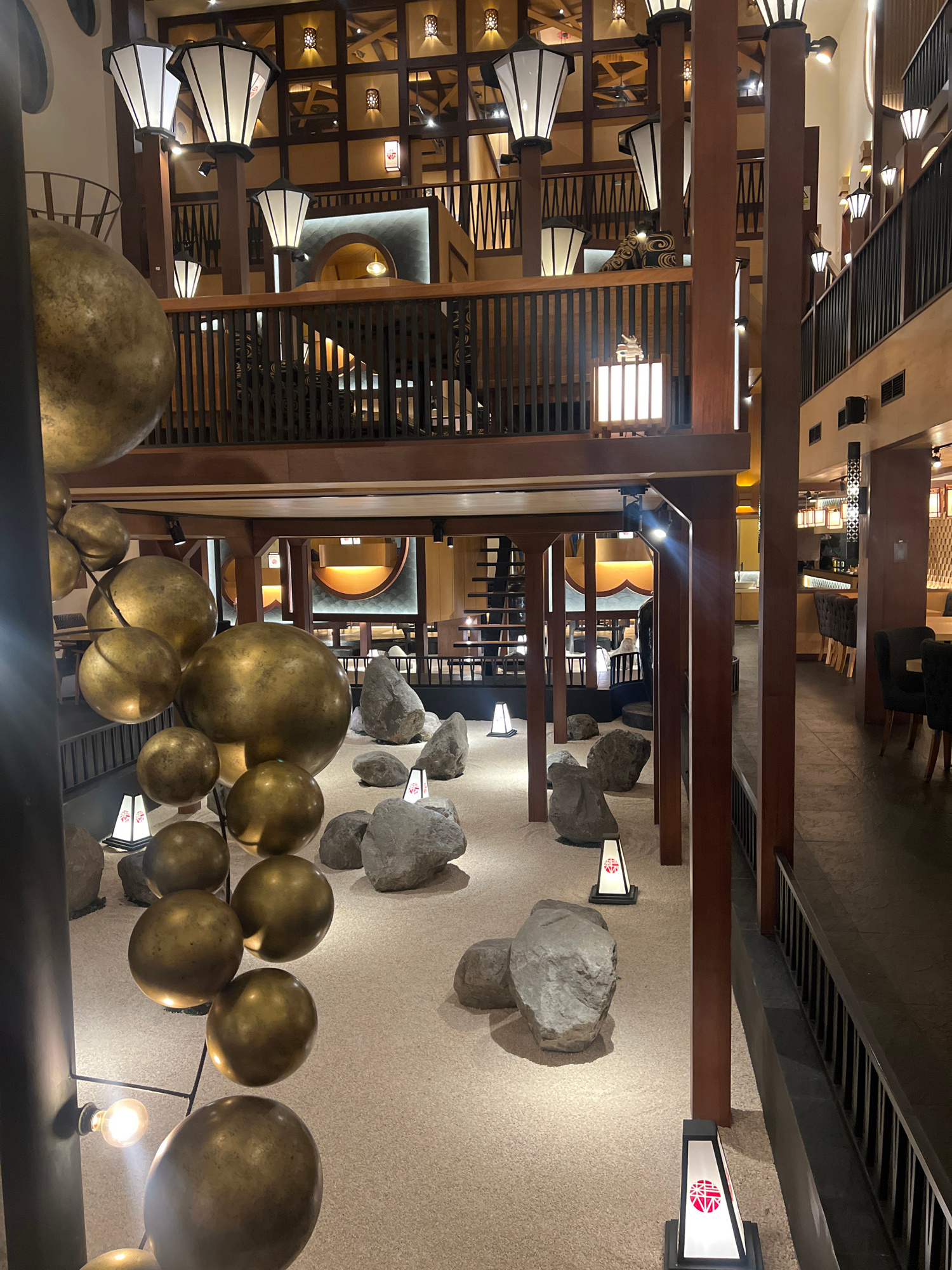 The image shows the interior of a building in North Kuta, Indonesia. The interior design features a blend of modern and traditional Indonesian elements. The building has multiple levels, with wooden b…read more