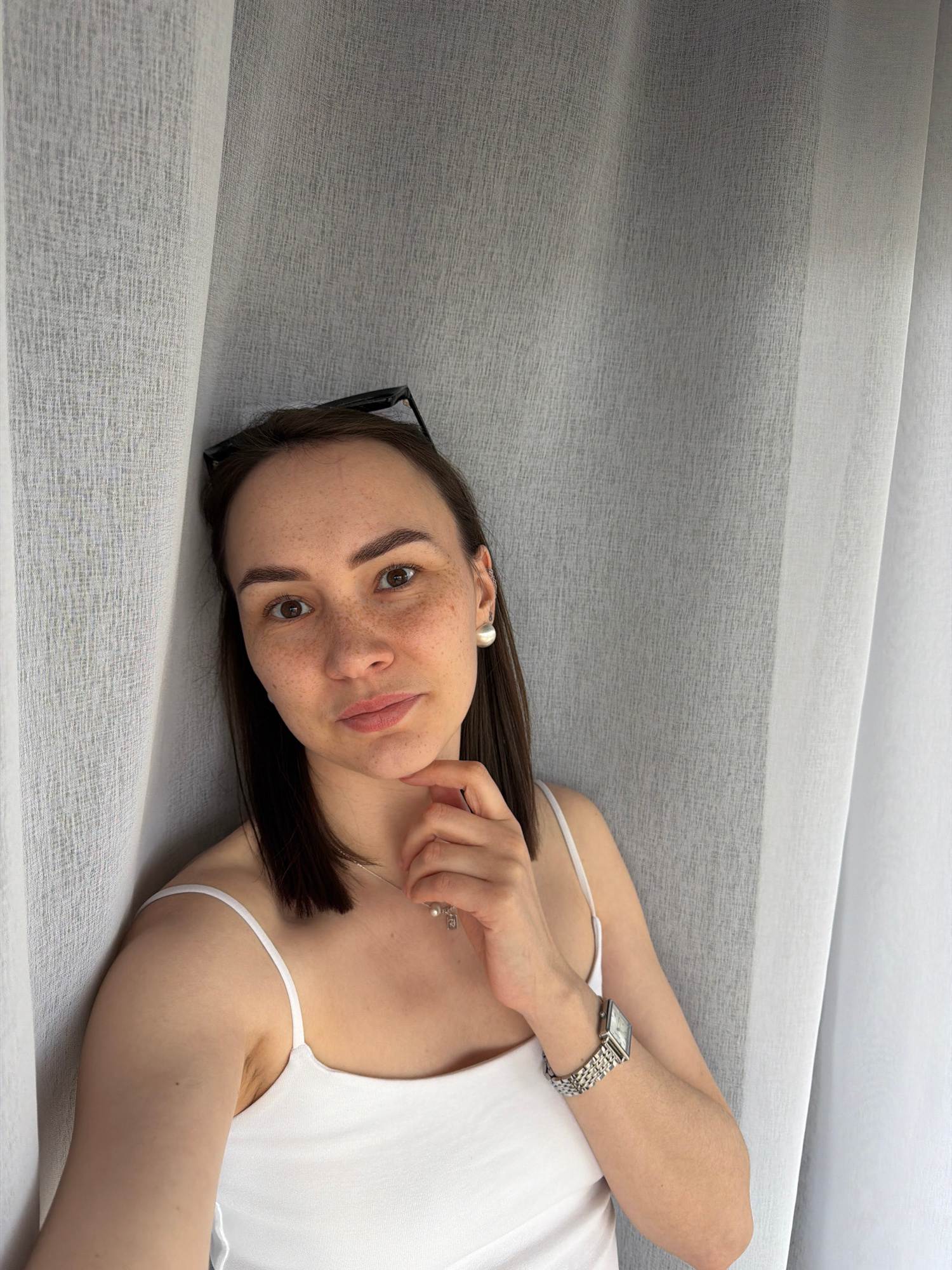 A young woman with fair skin and brown hair is lying on a gray textured surface, possibly fabric. She is wearing a white tank top, a silver wristwatch, and pearl earrings. A pair of glasses are restinβ¦read more