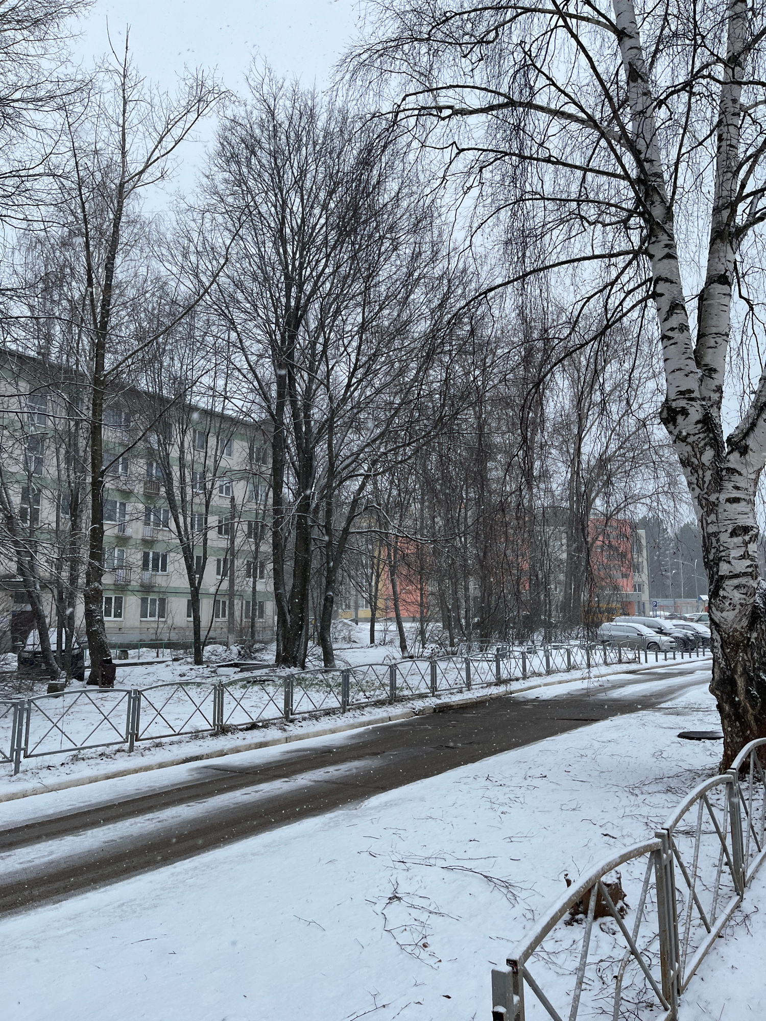 The image depicts a winter scene in what appears to be a residential area of Chaikovsky, Russia. Snow covers the ground and is falling lightly. Several leafless trees line a street or sidewalk. A meta…read more
