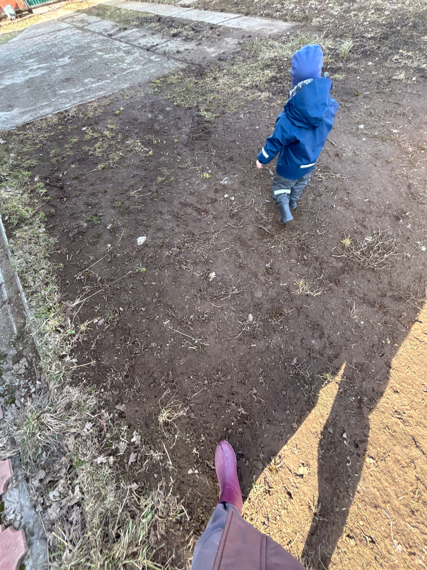 A child in a blue jacket and gray boots is playing in a dirt patch in Ферма, Russia. An adult in a brown coat and pink rubber boot stands nearby, casting a shadow. There is a concrete path on the left…read more