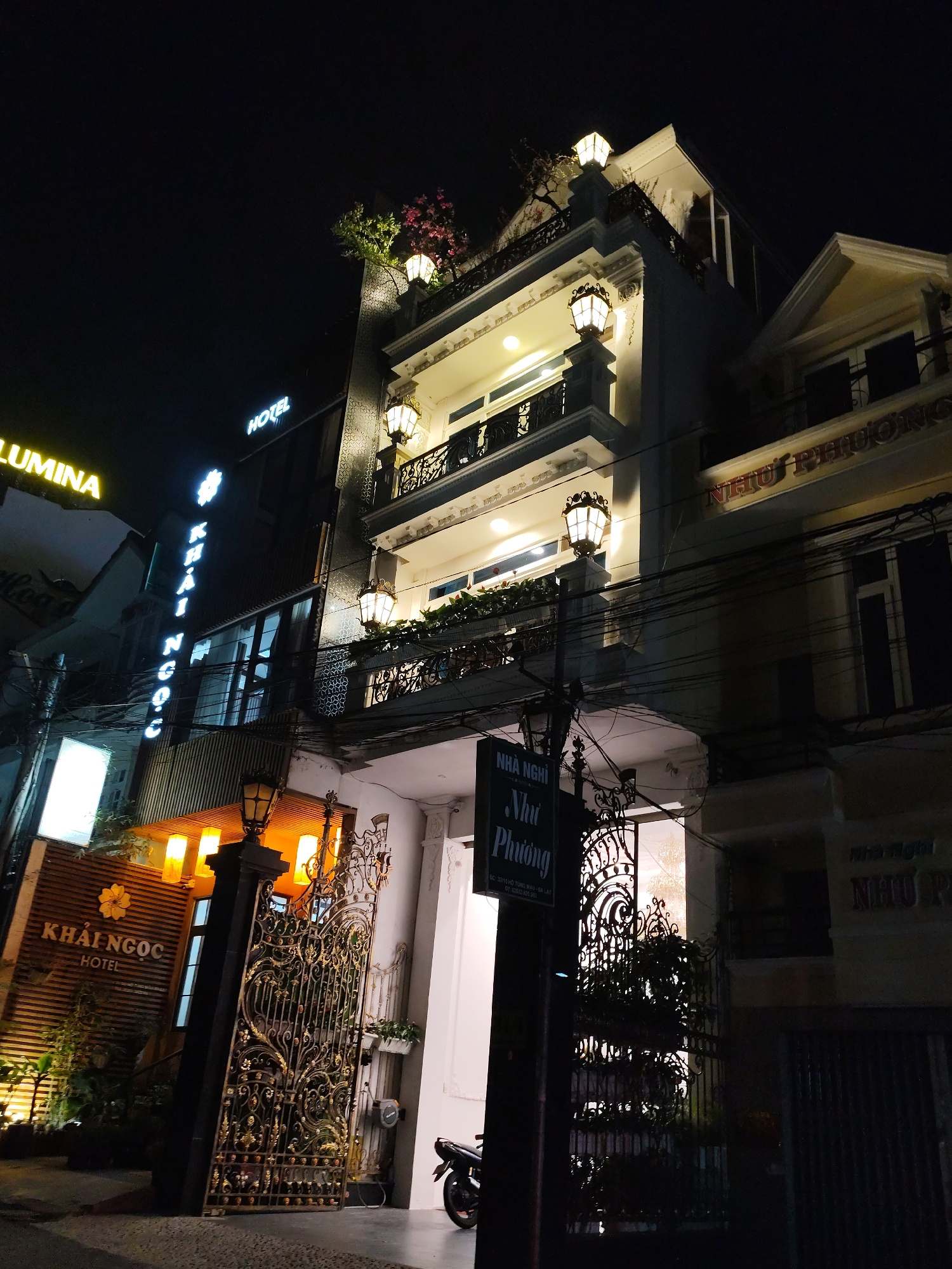 A nighttime shot captures two adjacent buildings, likely hotels or guesthouses, in Da Lat, Vietnam. The building on the left, marked "KHAI NGOC HOTEL" in neon lights and also in a lit sign with a yell…read more