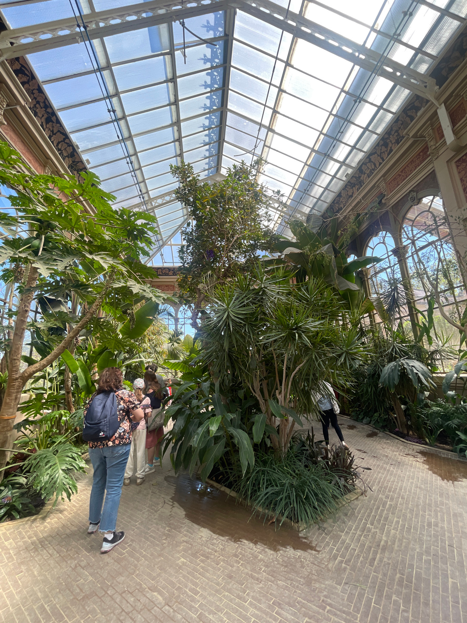 The image shows a scene inside a greenhouse. There are various tropical plants, including palms, banana plants, and other leafy greens. Several people are observing the plants. The greenhouse has a hi…read more