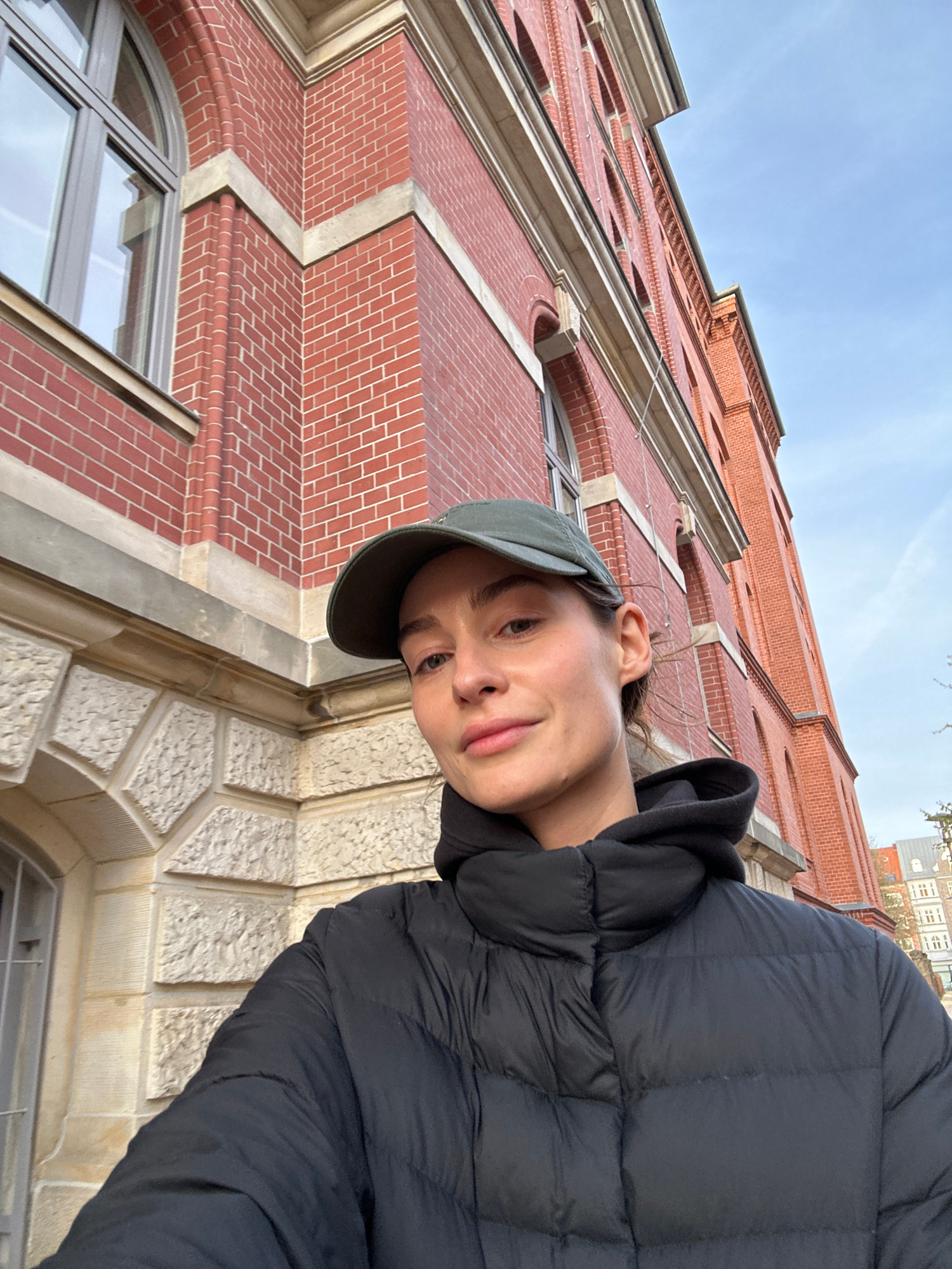 A person is standing in front of a brick building. The building is likely located in the city of Kiel, Germany, based on the architectural style. The person is wearing a black puffer jacket and a dark…read more