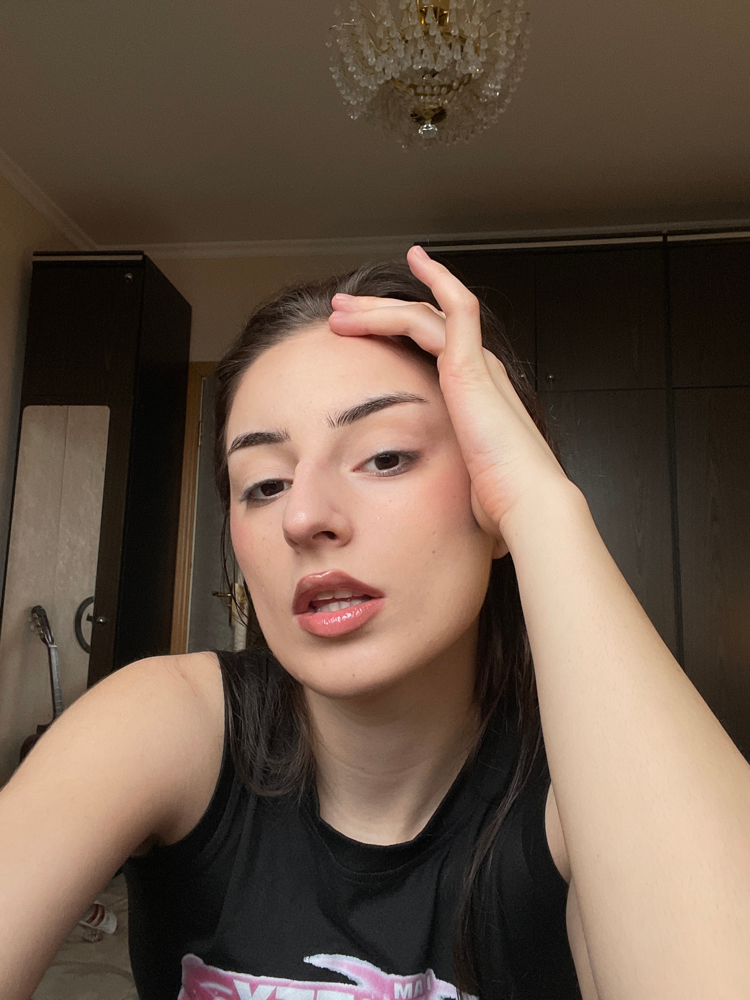 The media file presents an indoor selfie of a young woman, captured in Moscow, Russia. The image is oriented with a noticeable clockwise tilt. The woman, with dark hair and prominent dark eyebrows, is…read more