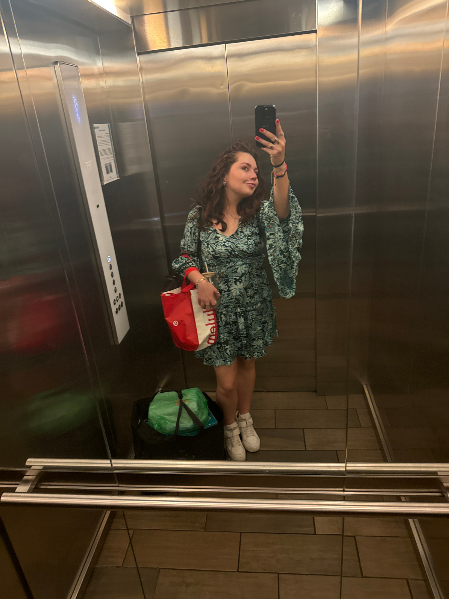 A young woman is taking a selfie in an elevator. She is wearing a green patterned dress and white sneakers. She is holding a red and white tote bag and a green bag is at her feet. The elevator has staβ¦read more