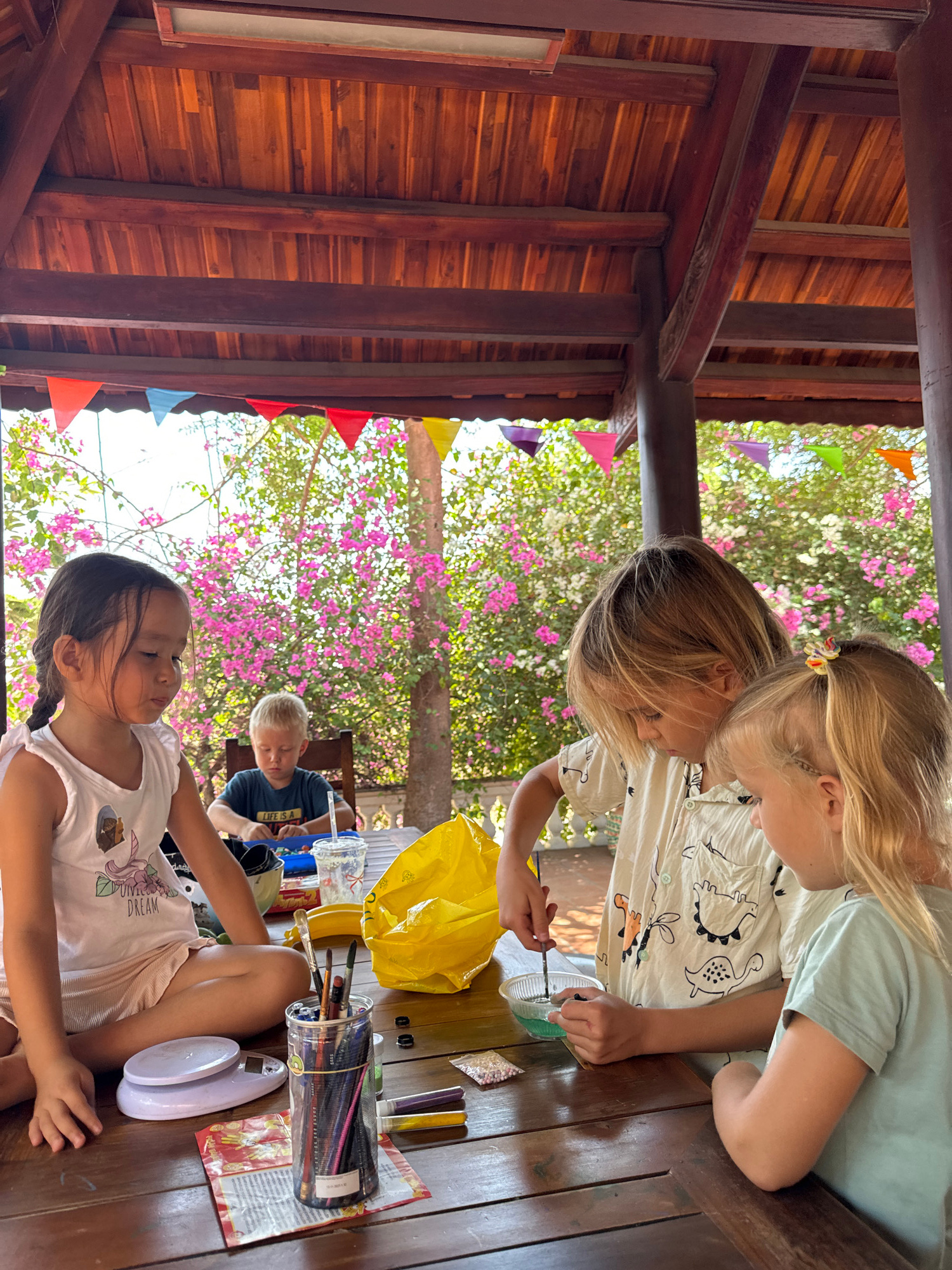 This outdoor scene captures three children engaged in a creative activity at a wooden table, likely in a covered patio or open-air area in Mũi Né, Vietnam. The wooden structure features dark beams and…read more