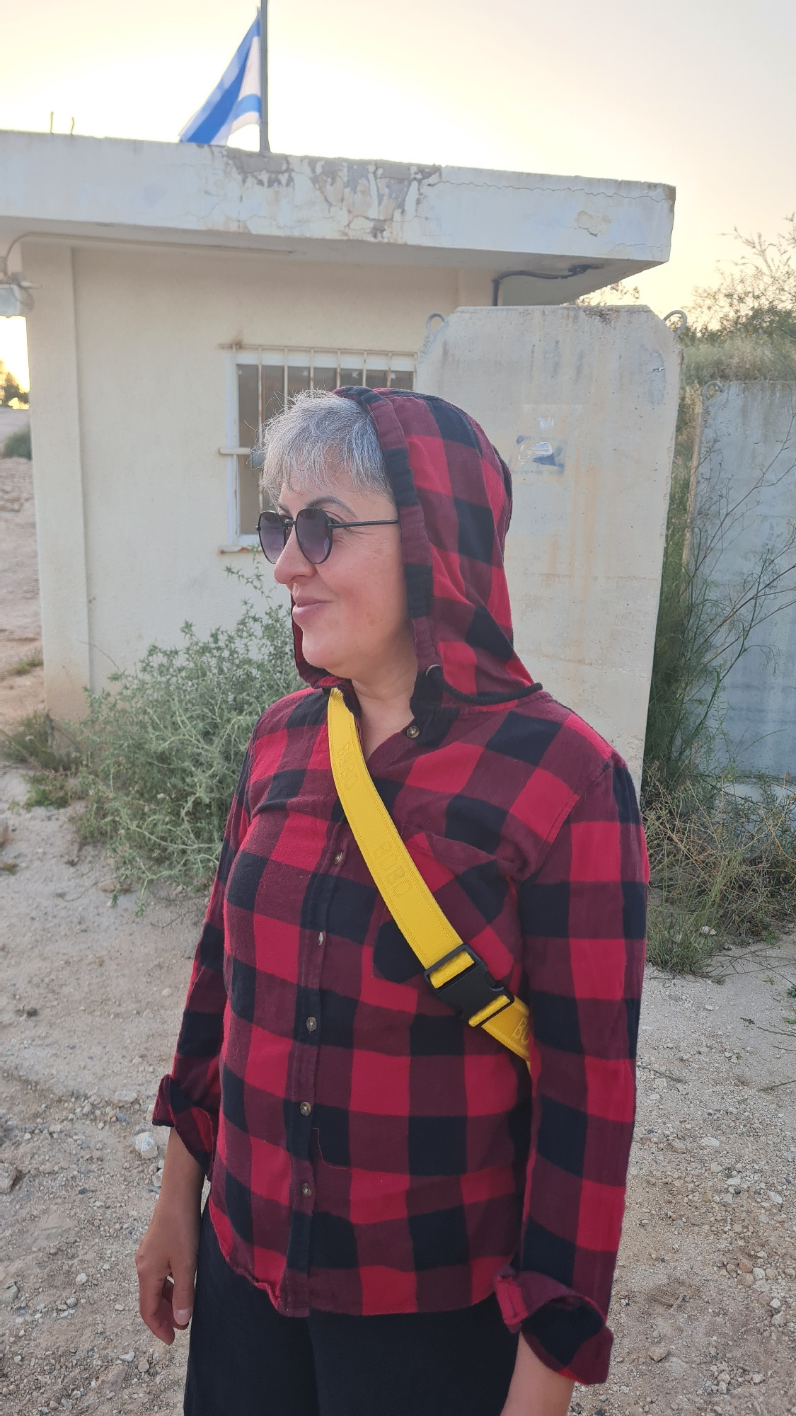 A medium shot captures a woman in a red and black checkered hooded shirt, accessorized with a bright yellow crossbody bag. She's wearing dark sunglasses. She is standing outside a building with a blue…read more
