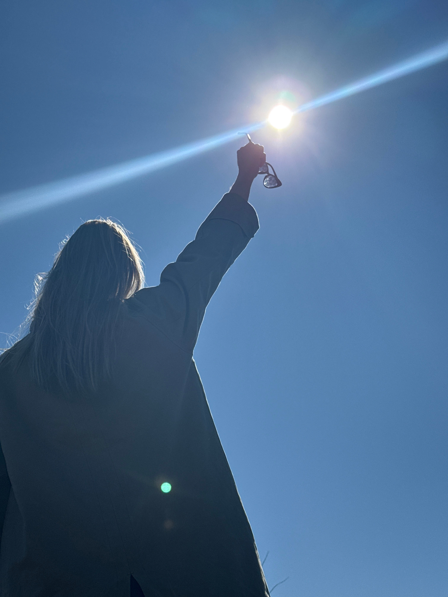 A low-angle shot shows a person holding eyeglasses toward the sun in a clear blue sky. The sun is high and bright, creating a lens flare. The person is silhouetted, with their blond hair visible. They…read more