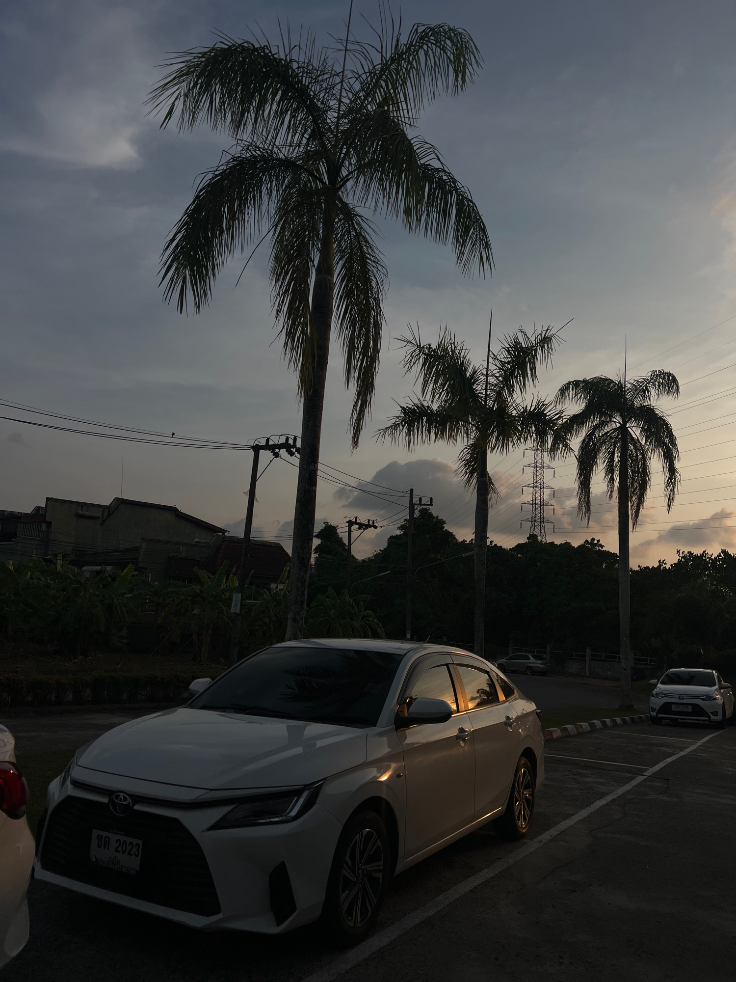 A white car is parked on an asphalt lot with painted parking lines in Kathu, Thailand. Three tall palm trees extend upward, and electrical power lines are visible in the background. A building can be…read more