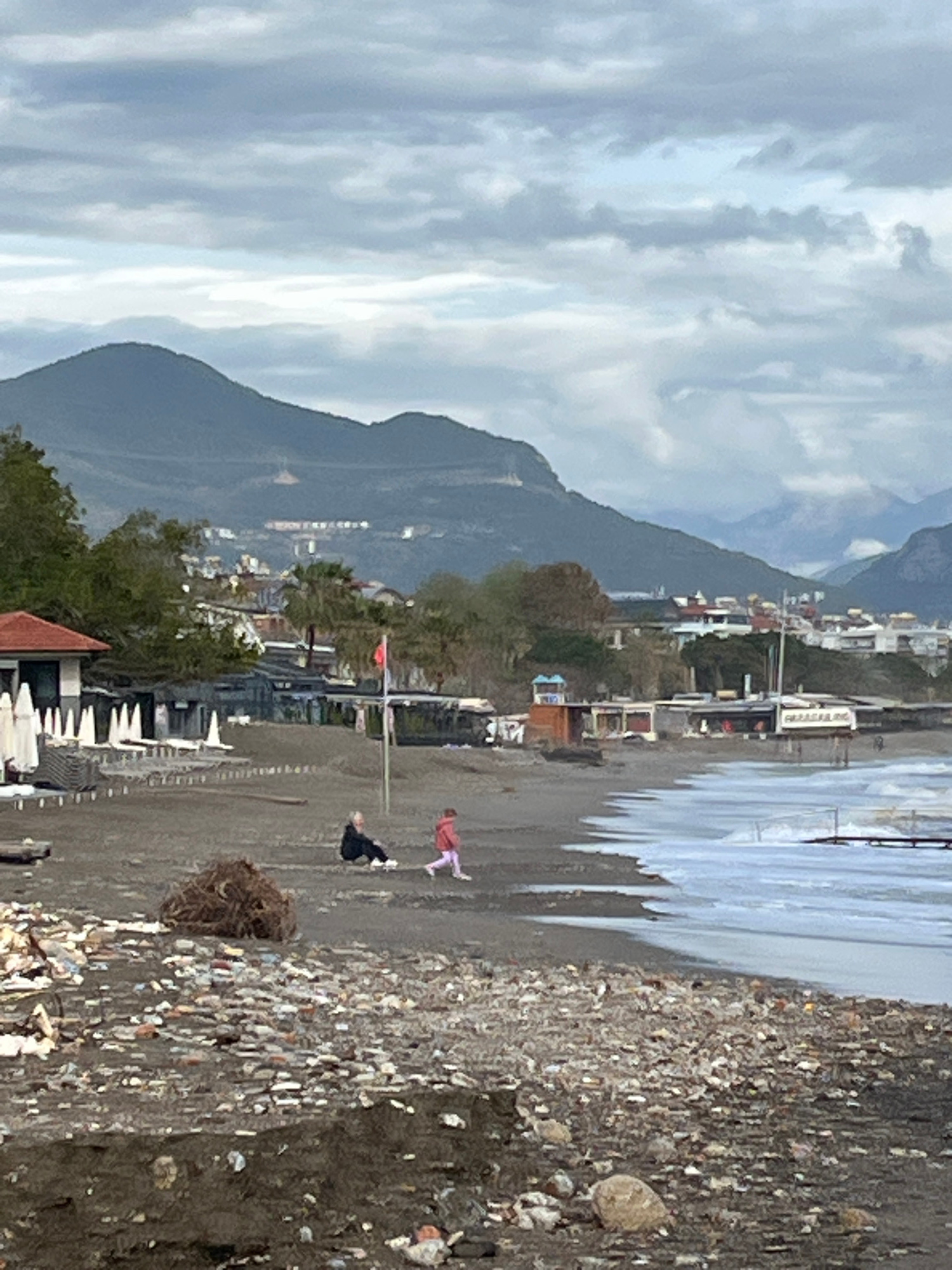 The image depicts a coastal scene in Alanya, Turkey, characterized by a beach with a mix of sand and pebbles, a distant mountain range, and a cloudy sky. In the foreground, a pile of mixed debris lies…read more