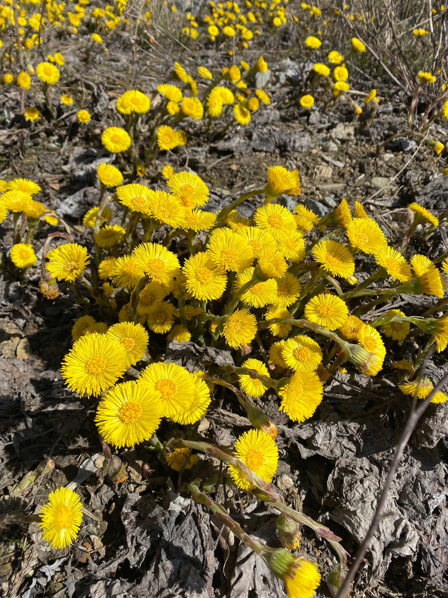 The image shows a dense patch of yellow flowers, possibly Coltsfoot (Tussilago farfara), growing on rocky, barren ground. The flowers are the dominant element, exhibiting a bright yellow color and tigβ¦read more