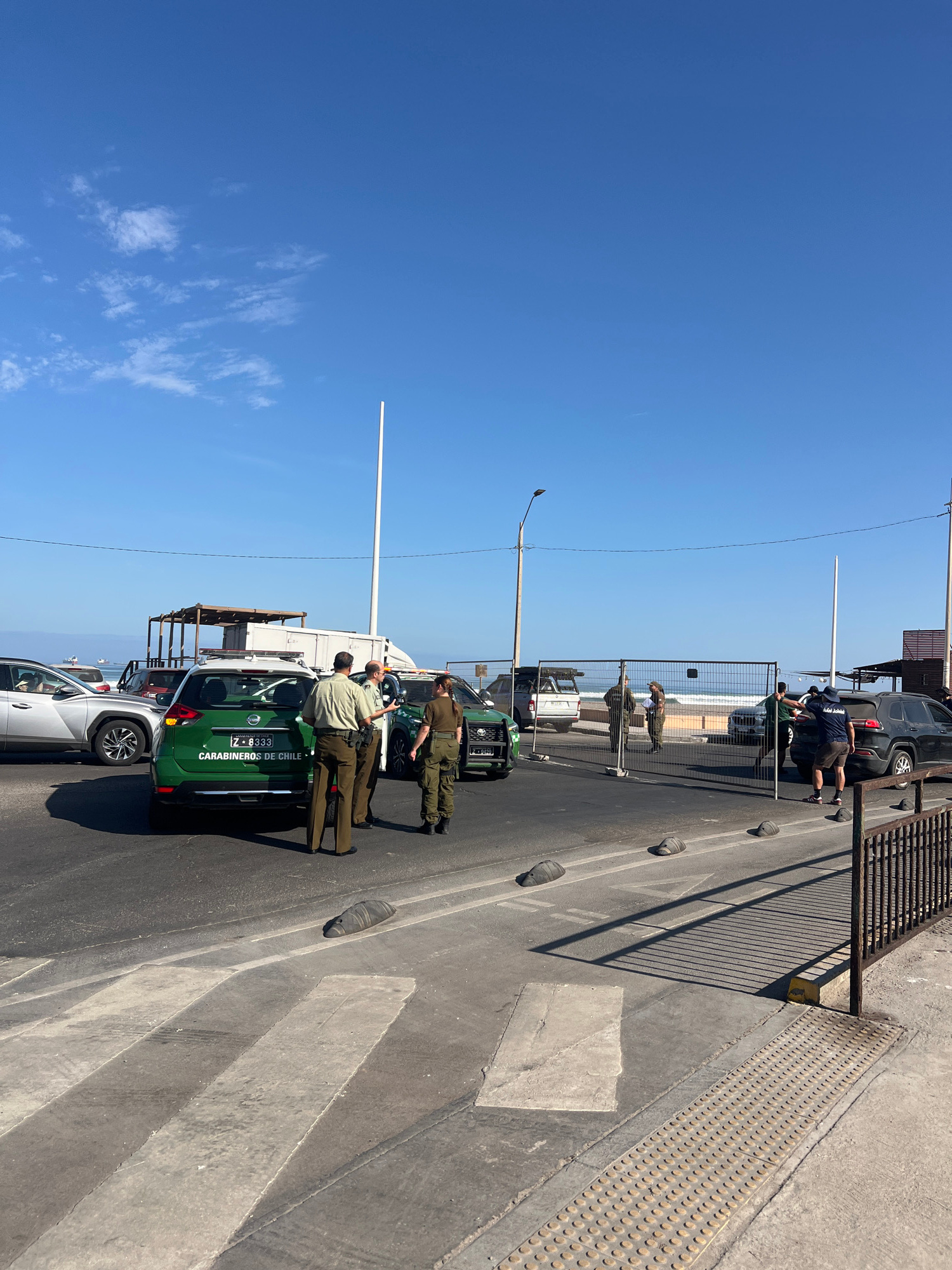 The image shows a street scene in Arica, Chile, with a focus on two Carabinero de Chile (Chilean police) officers standing next to their parked vehicle. The green and white police vehicle is parked neβ¦read more
