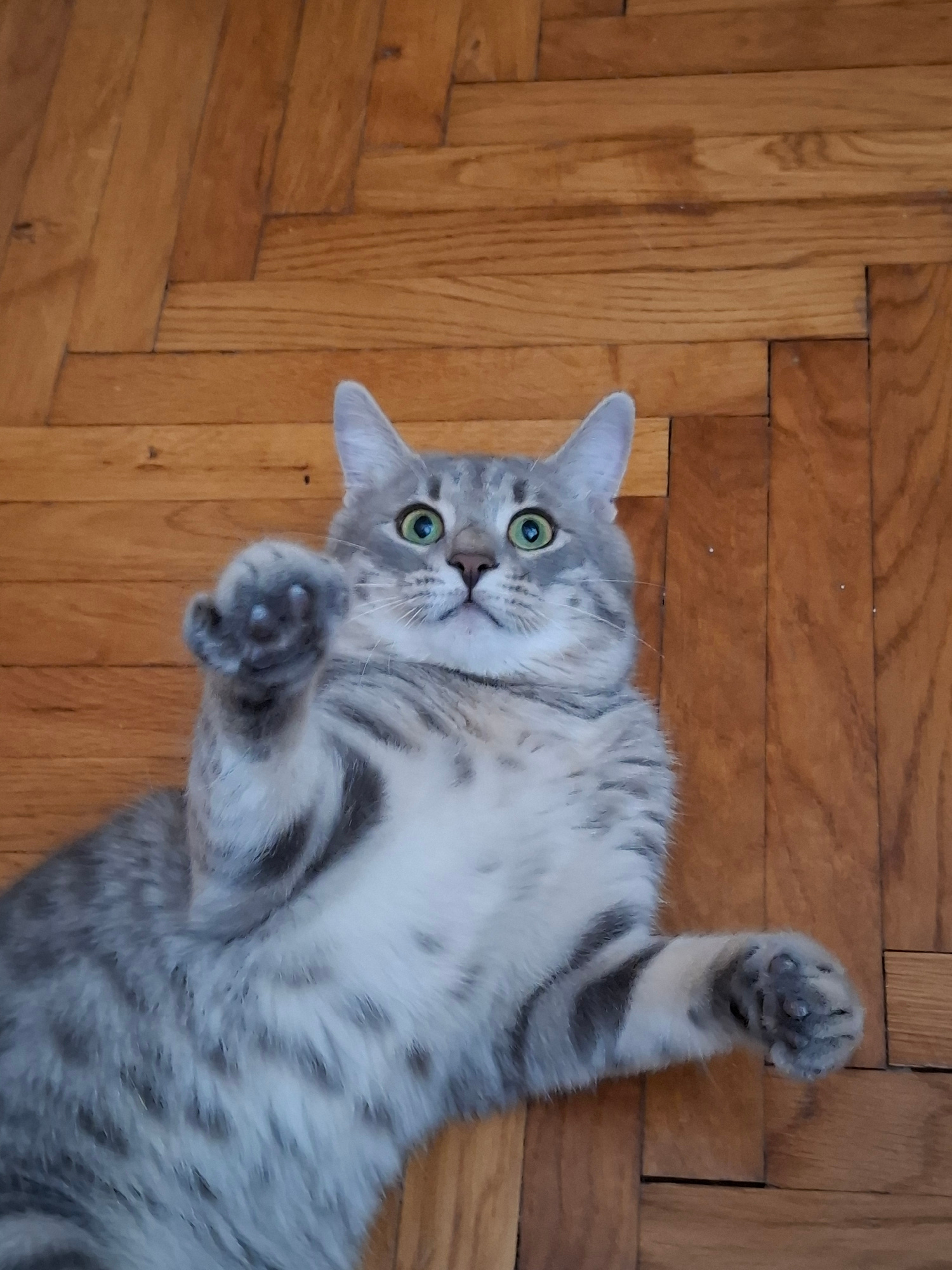 A medium-sized, gray tabby cat with green eyes is lying on its back on a wooden parquet floor. The cat is oriented with its head and right paw towards the upper left of the frame and its body extendin…read more