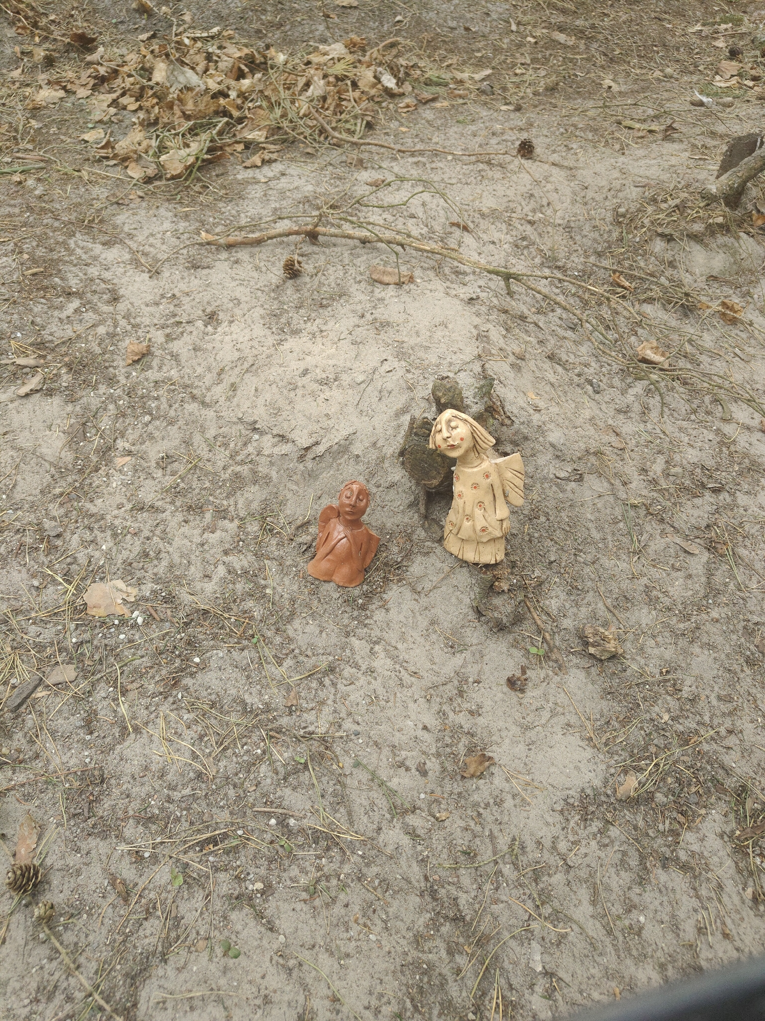 The image depicts two small figurines on a ground surface covered with sand, dry leaves, twigs, and pine needles. One figurine is reddish-brown and depicts a character with hands clasped. The other isβ¦read more