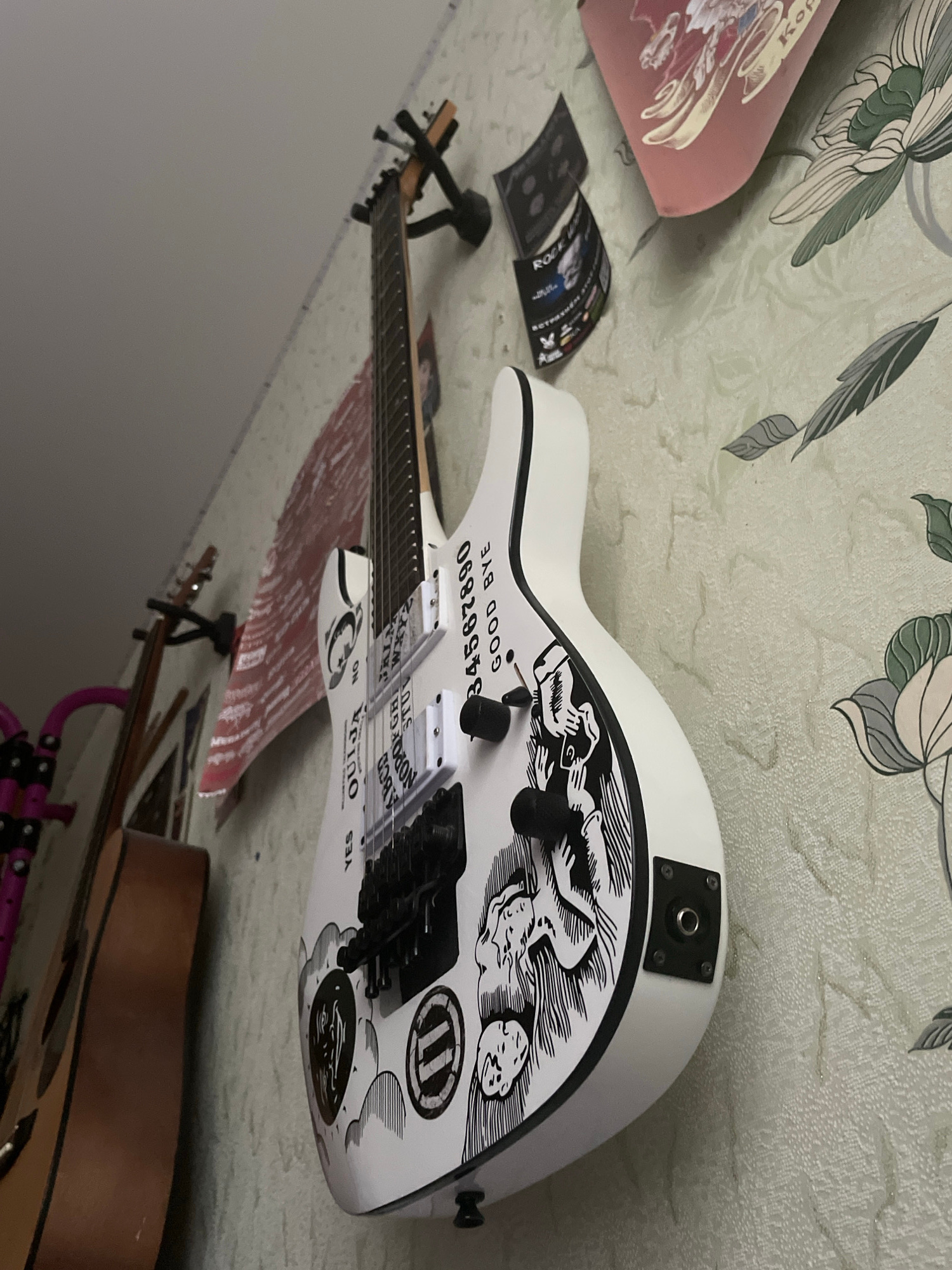 This image captures an indoor scene, likely a room located in Chaikovsky, Russia. The background features light-colored, textured wallpaper adorned with a decorative pattern of green and grey leaves.…read more