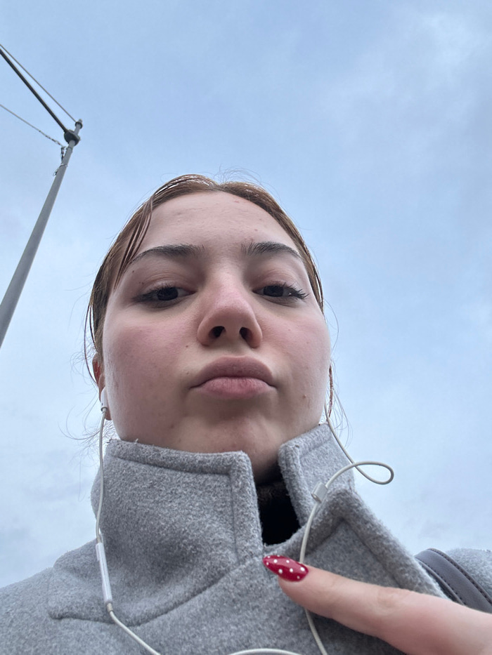 An upward-facing, low-angle selfie captures a young person looking down at the camera against an overcast sky. The subject, likely female, occupies the majority of the frame, positioned diagonally wit…read more