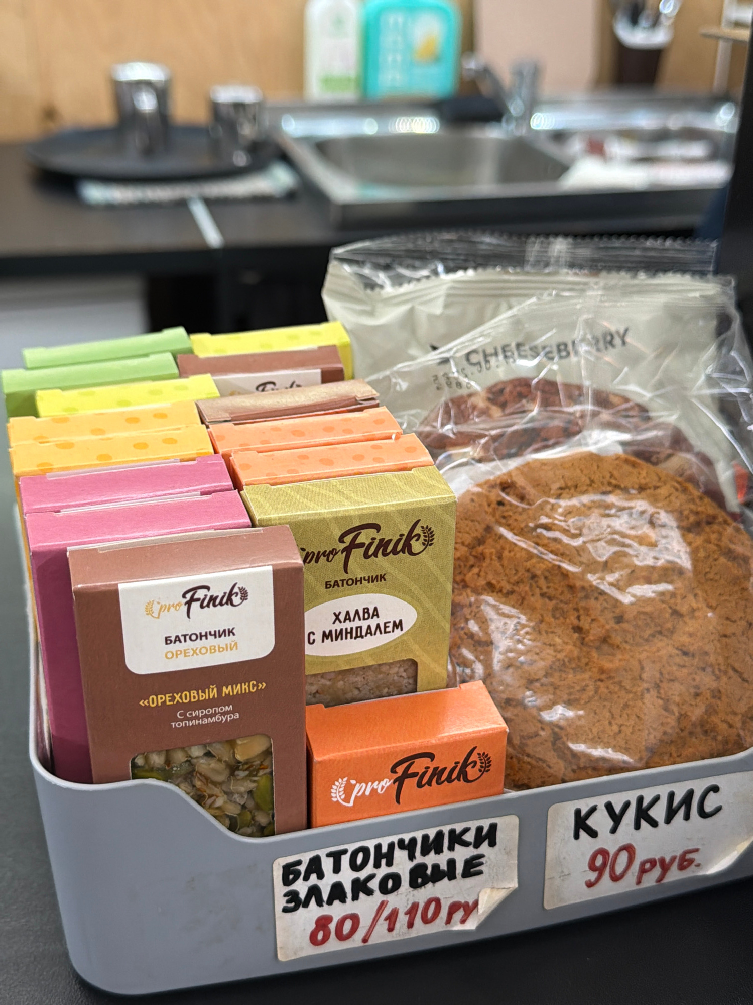 The image shows a close-up of a selection of packaged snacks and treats displayed in a gray container, likely for sale. The snacks include individually wrapped cookies labeled "CHEESEBIARY" and indivi…read more