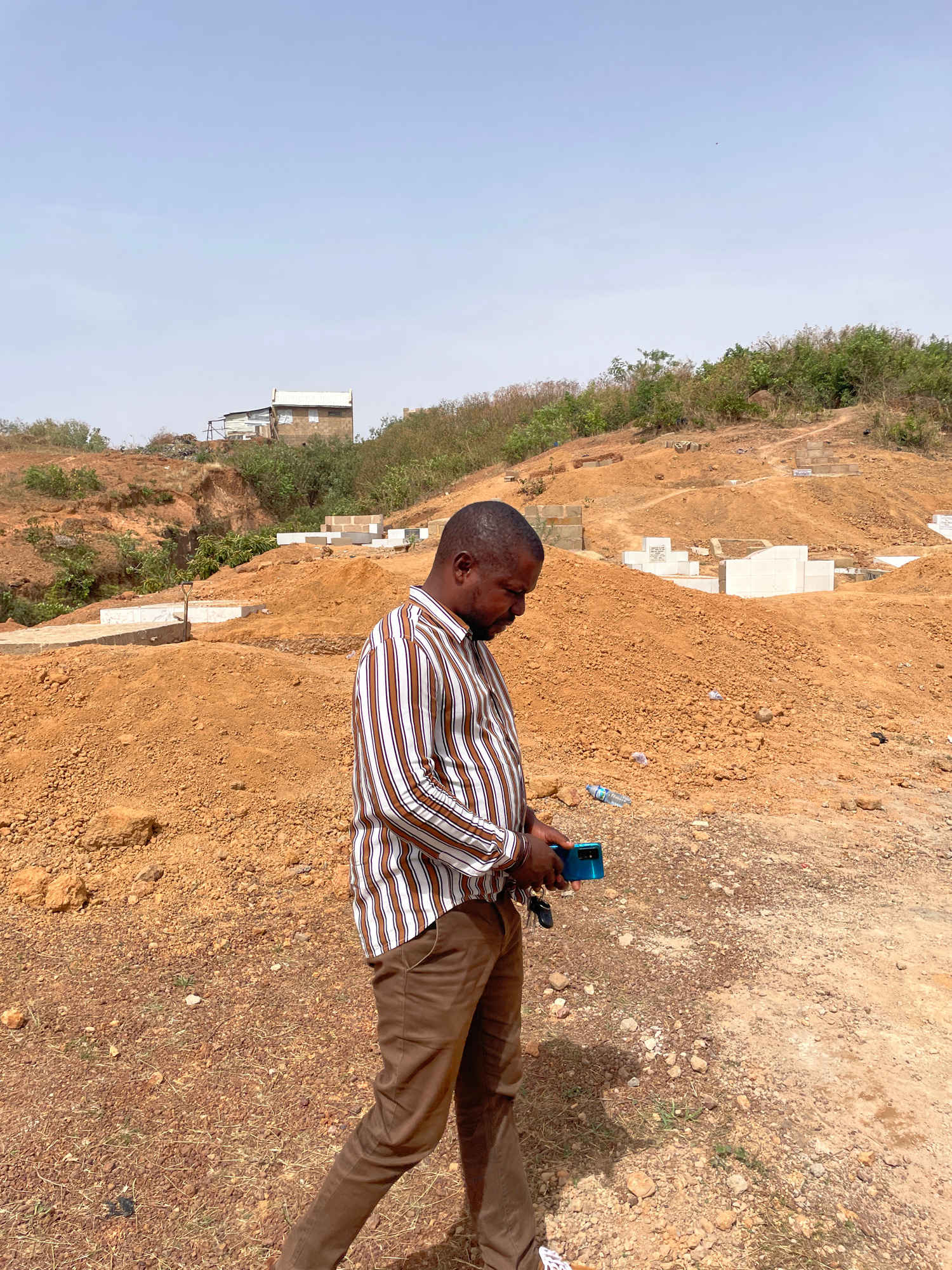 A man stands on a dirt slope in Bar Jirgi Summa, Nigeria. He is using a blue mobile phone. The slope is part of a hill that features vegetation and concrete structures, possibly graves or building fou…read more