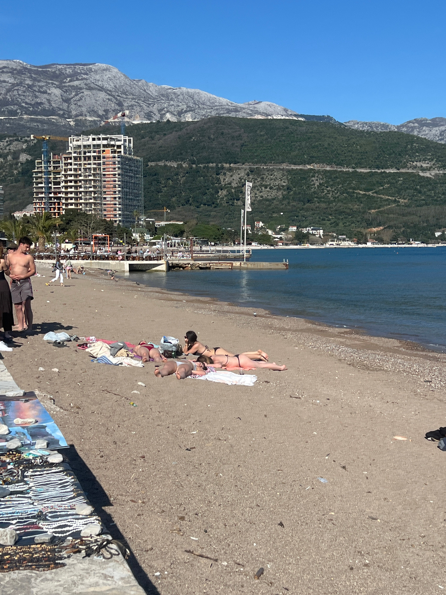 The image shows a beach scene in Budva, Montenegro. A mountainous landscape with green vegetation and some buildings rises sharply on the left side of the image. A tall, unfinished building stands clo…read more