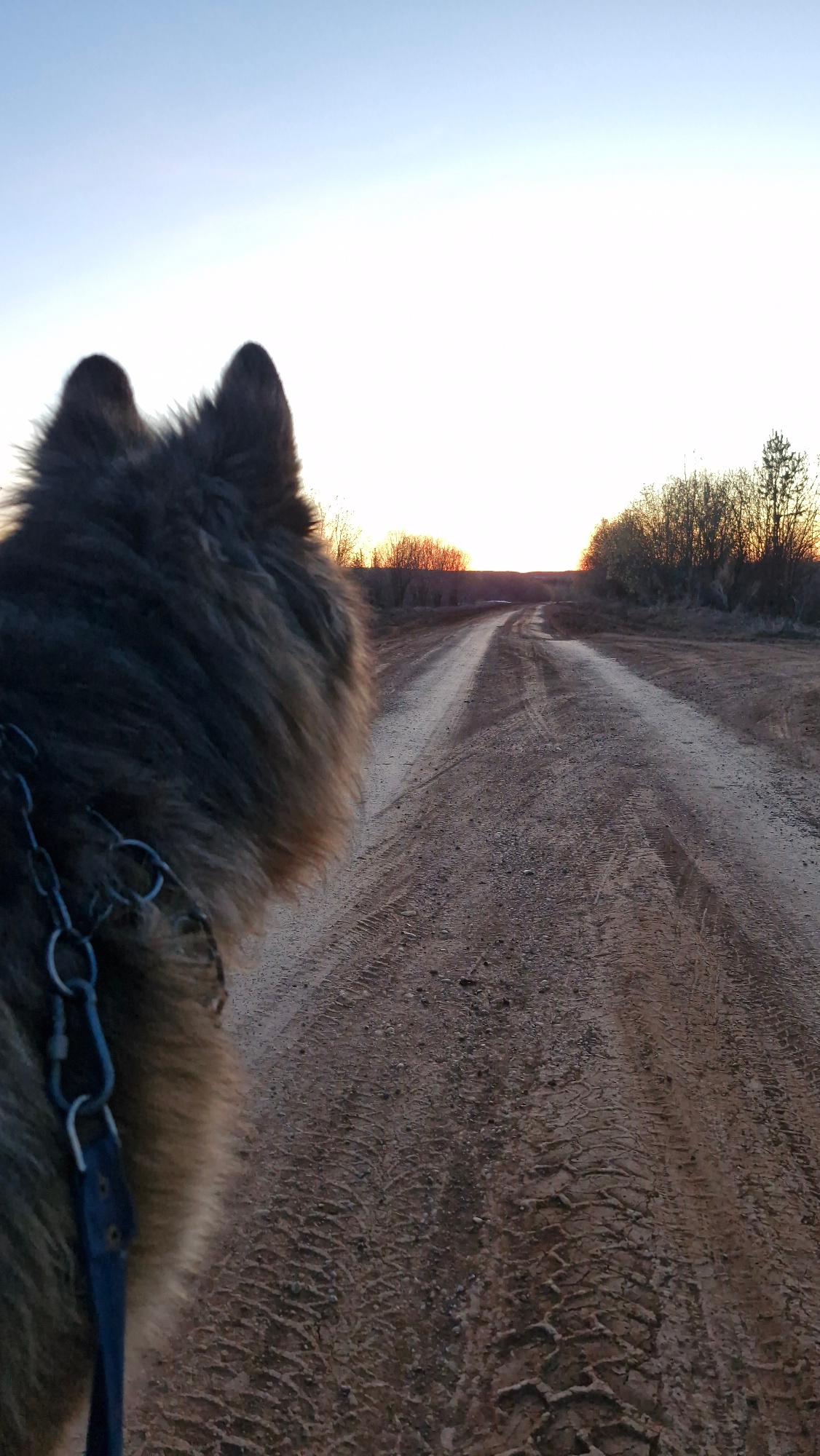 The image depicts a dirt road leading into a bright, hazy sunset. The road surface shows tire tracks. On either side of the road are low-lying bushes or trees. In the foreground, the back of a brown,…read more